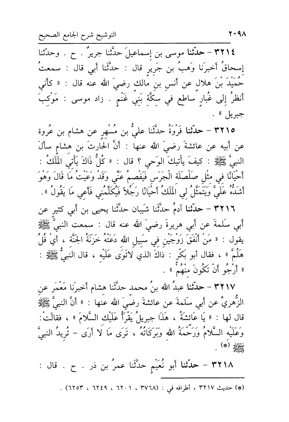 3214 - حَدَّثَنَا مُوسَى بْنُ إِسْمَاعِيلَ، حَدَّثَنَا جَرِيرٌ، ح حَدَّثَنِي إِسْحَاقُ، أَخْبَرَنَا وَهْبُ بْنُ جَرِيرٍ، حَدَّثَنَا أَبِي، قَالَ: سَمِعْتُ حُمَيْدَ بْنَ هِلاَلٍ، عَنْ أَنَسِ بْنِ مَالِكٍ رَضِيَ اللَّهُ عَنْهُ، قَالَ: «كَأَنِّي أَنْظُرُ إِلَى غُبَارٍ سَاطِعٍ فِي سِكَّةِ بَنِي غَنْمٍ» زَادَ مُوسَى، مَوْكِبَ جِبْرِيلَ.