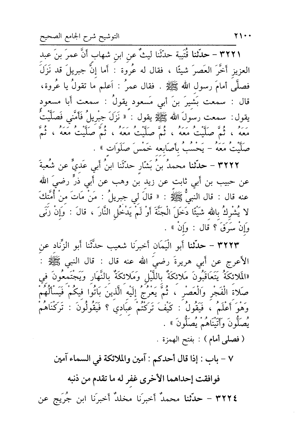 3221 - حَدَّثَنَا قُتَيْبَةُ، حَدَّثَنَا لَيْثٌ، عَنِ ابْنِ شِهَابٍ أَنَّ عُمَرَ بْنَ عَبْدِ العَزِيزِ أَخَّرَ العَصْرَ شَيْئًا، فَقَالَ لَهُ عُرْوَةُ: أَمَا إِنَّ جِبْرِيلَ قَدْ نَزَلَ فَصَلَّى أَمَامَ رَسُولِ اللَّهِ صَلَّى اللهُ عَلَيْهِ وَسَلَّمَ، فَقَالَ عُمَرُ اعْلَمْ مَا تَقُولُ يَا عُرْوَةُ قَالَ: سَمِعْتُ بَشِيرَ بْنَ أَبِي مَسْعُودٍ يَقُولُ: سَمِعْتُ أَبَا مَسْعُودٍ يَقُولُ: سَمِعْتُ رَسُولَ اللَّهِ صَلَّى اللهُ عَلَيْهِ وَسَلَّمَ يَقُولُ: «نَزَلَ جِبْرِيلُ فَأَمَّنِي، فَصَلَّيْتُ مَعَهُ، ثُمَّ صَلَّيْتُ مَعَهُ، ثُمَّ صَلَّيْتُ مَعَهُ، ثُمَّ صَلَّيْتُ مَعَهُ، ثُمَّ صَلَّيْتُ مَعَهُ» يَحْسُبُ بِأَصَابِعِهِ خَمْسَ صَلَوَاتٍ.