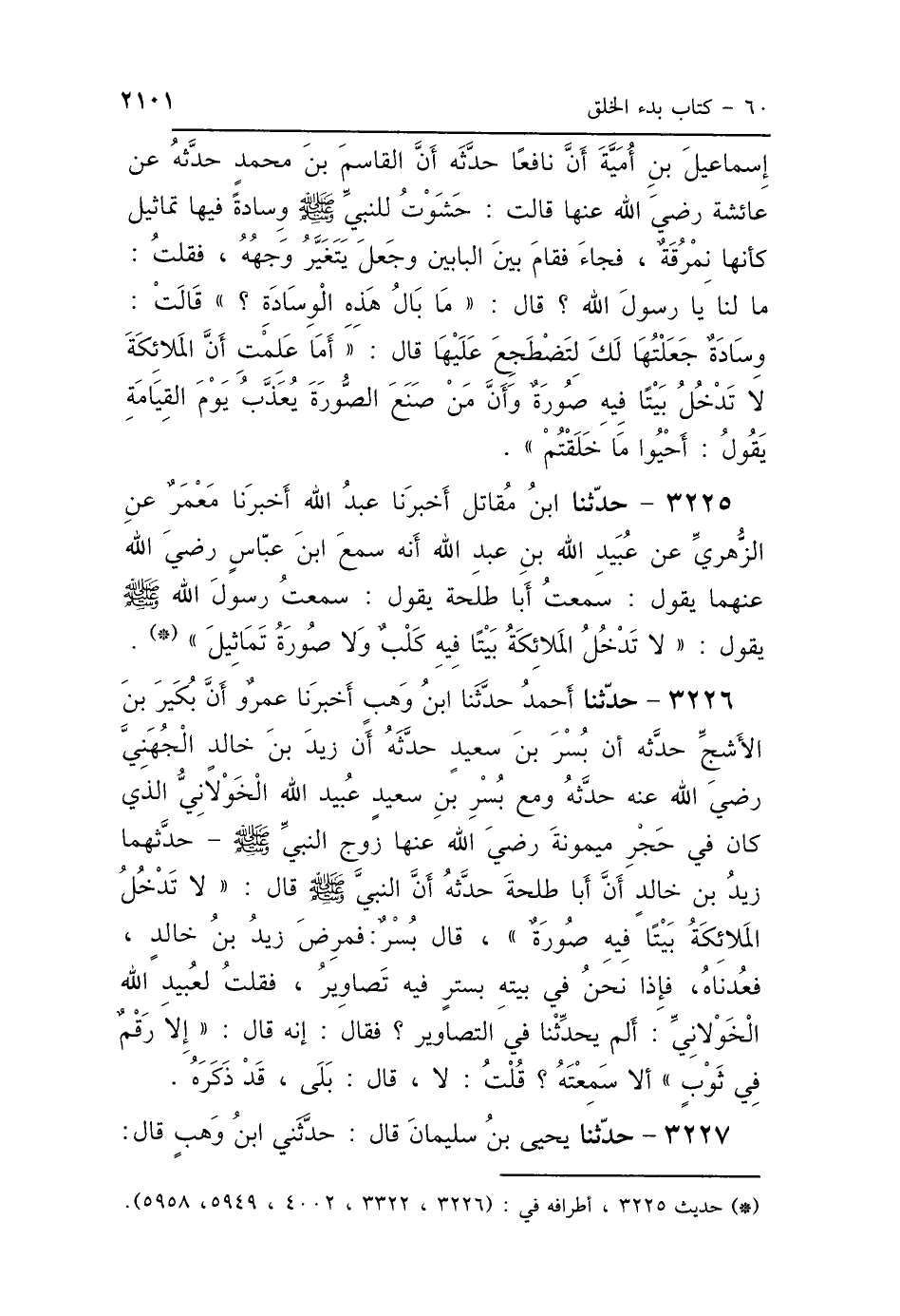 3226 - حَدَّثَنَا أَحْمَدُ، حَدَّثَنَا ابْنُ وَهْبٍ، أَخْبَرَنَا عَمْرٌو، أَنَّ بُكَيْرَ بْنَ الأَشَجِّ حَدَّثَهُ، أَنَّ بُسْرَ بْنَ سَعِيدٍ حَدَّثَهُ، أَنَّ زَيْدَ بْنَ خَالِدٍ الجُهَنِيَّ رَضِيَ اللَّهُ عَنْهُ حَدَّثَهُ، وَمَعَ بُسْرِ بْنِ سَعِيدٍ عُبَيْدُ اللَّهِ الخَوْلاَنِيُّ الَّذِي كَانَ فِي حِجْرِ مَيْمُونَةَ رَضِيَ اللَّهُ عَنْهَا زَوْجِ النَّبِيِّ صَلَّى اللهُ عَلَيْهِ وَسَلَّمَ، حَدَّثَهُمَا زَيْدُ بْنُ خَالِدٍ، أَنَّ أَبَا طَلْحَةَ حَدَّثَهُ أَنَّ النَّبِيَّ صَلَّى اللهُ عَلَيْهِ وَسَلَّمَ، قَالَ: «لاَ تَدْخُلُ المَلاَئِكَةُ بَيْتًا فِيهِ صُورَةٌ» قَالَ بُسْرٌ: فَمَرِضَ زَيْدُ بْنُ خَالِدٍ فَعُدْنَاهُ، فَإِذَا نَحْنُ فِي بَيْتِهِ بِسِتْرٍ فِيهِ تَصَاوِيرُ، فَقُلْتُ لِعُبَيْدِ اللَّهِ الخَوْلاَنِيِّ: أَلَمْ يُحَدِّثْنَا فِي التَّصَاوِيرِ؟ فَقَالَ: إِنَّهُ قَالَ: إِلَّا رَقْمٌ فِي ثَوْبٍ أَلاَ سَمِعْتَهُ قُلْتُ لاَ، قَالَ: بَلَى قَدْ ذَكَرَهُ.