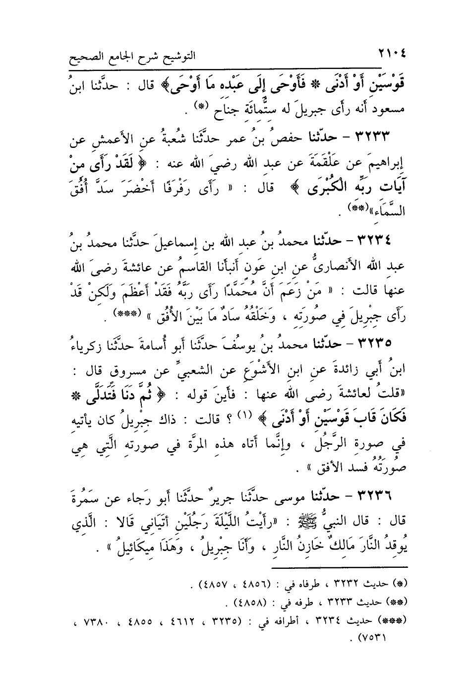 3235 - حَدَّثَنِي مُحَمَّدُ بْنُ يُوسُفَ، حَدَّثَنَا أَبُو أُسَامَةَ، حَدَّثَنَا زَكَرِيَّاءُ بْنُ أَبِي زَائِدَةَ، عَنِ ابْنِ الأَشْوَعِ، عَنِ الشَّعْبِيِّ، عَنْ مَسْرُوقٍ، قَالَ: قُلْتُ لِعَائِشَةَ رَضِيَ اللَّهُ عَنْهَا: فَأَيْنَ قَوْلُهُ {ثُمَّ دَنَا فَتَدَلَّى فَكَانَ قَابَ قَوْسَيْنِ أَوْ أَدْنَى} [النجم: 9] قَالَتْ: «ذَاكَ جِبْرِيلُ كَانَ يَأْتِيهِ فِي صُورَةِ الرَّجُلِ، وَإِنَّهُ أَتَاهُ هَذِهِ المَرَّةَ فِي صُورَتِهِ الَّتِي هِيَ صُورَتُهُ فَسَدَّ الأُفُقَ».