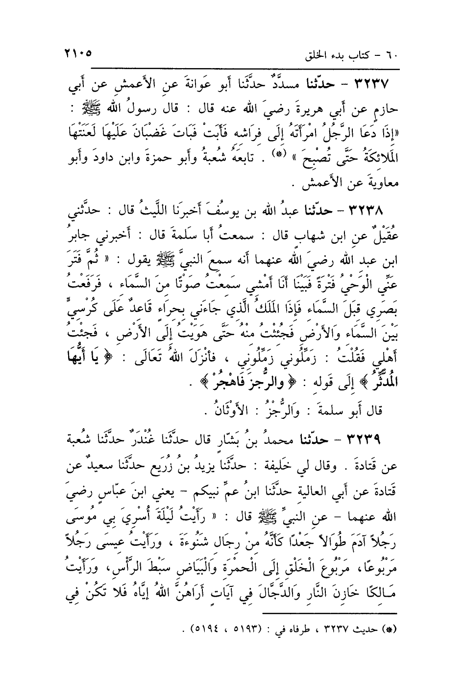 3237 - حَدَّثَنَا مُسَدَّدٌ، حَدَّثَنَا أَبُو عَوَانَةَ، عَنِ الأَعْمَشِ، عَنْ أَبِي حَازِمٍ، عَنْ أَبِي هُرَيْرَةَ رَضِيَ اللَّهُ عَنْهُ، قَالَ: قَالَ رَسُولُ اللَّهِ صَلَّى اللهُ عَلَيْهِ وَسَلَّمَ: «إِذَا دَعَا الرَّجُلُ امْرَأَتَهُ إِلَى فِرَاشِهِ فَأَبَتْ فَبَاتَ غَضْبَانَ عَلَيْهَا لَعَنَتْهَا المَلاَئِكَةُ حَتَّى تُصْبِحَ» تَابَعَهُ شُعْبَةُ، وَأَبُو حَمْزَةَ، وَابْنُ دَاوُدَ، وَأَبُو مُعَاوِيَةَ، عَنِ الأَعْمَشِ.
