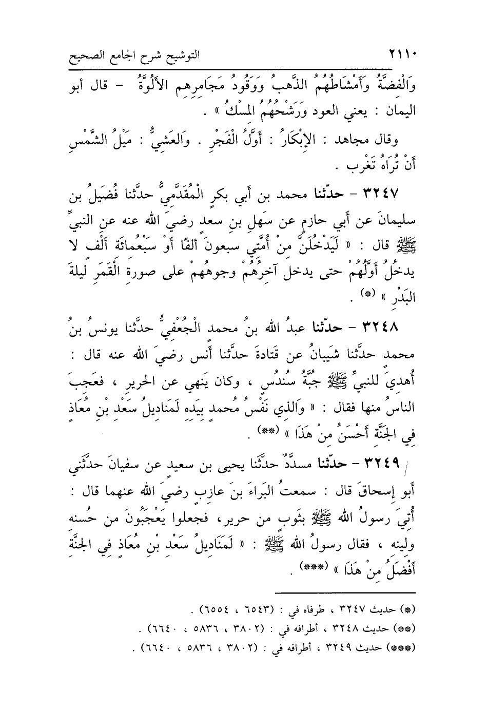 3247 - حَدَّثَنَا مُحَمَّدُ بْنُ أَبِي بَكْرٍ المُقَدَّمِيُّ، حَدَّثَنَا فُضَيْلُ بْنُ سُلَيْمَانَ، عَنْ أَبِي حَازِمٍ، عَنْ سَهْلِ بْنِ سَعْدٍ رَضِيَ اللَّهُ عَنْهُ، عَنِ النَّبِيِّ صَلَّى اللهُ عَلَيْهِ وَسَلَّمَ، قَالَ: «لَيَدْخُلَنَّ مِنْ أُمَّتِي سَبْعُونَ أَلْفًا، أَوْ سَبْعُ مِائَةِ أَلْفٍ، لاَ يَدْخُلُ أَوَّلُهُمْ حَتَّى يَدْخُلَ آخِرُهُمْ، وُجُوهُهُمْ عَلَى صُورَةِ القَمَرِ لَيْلَةَ البَدْرِ».