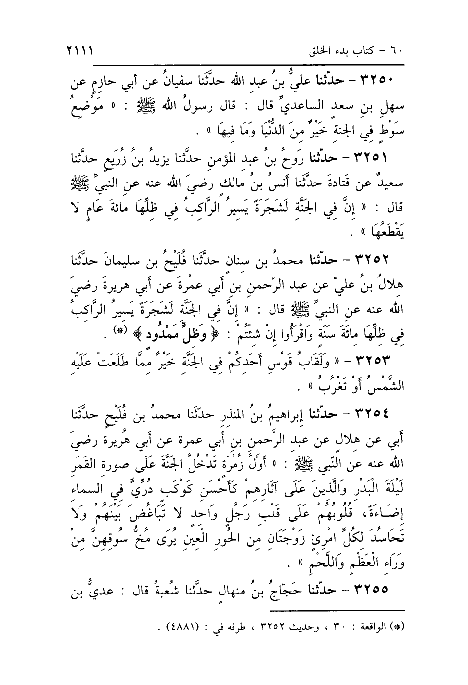 3251 - حَدَّثَنَا رَوْحُ بْنُ عَبْدِ المُؤْمِنِ، حَدَّثَنَا يَزِيدُ بْنُ زُرَيْعٍ، حَدَّثَنَا سَعِيدٌ، عَنْ قَتَادَةَ، حَدَّثَنَا أَنَسُ بْنُ مَالِكٍ رَضِيَ اللَّهُ عَنْهُ، عَنِ النَّبِيِّ صَلَّى اللهُ عَلَيْهِ وَسَلَّمَ، قَالَ: «إِنَّ فِي الجَنَّةِ لَشَجَرَةً يَسِيرُ الرَّاكِبُ فِي ظِلِّهَا مِائَةَ عَامٍ لاَ يَقْطَعُهَا».
