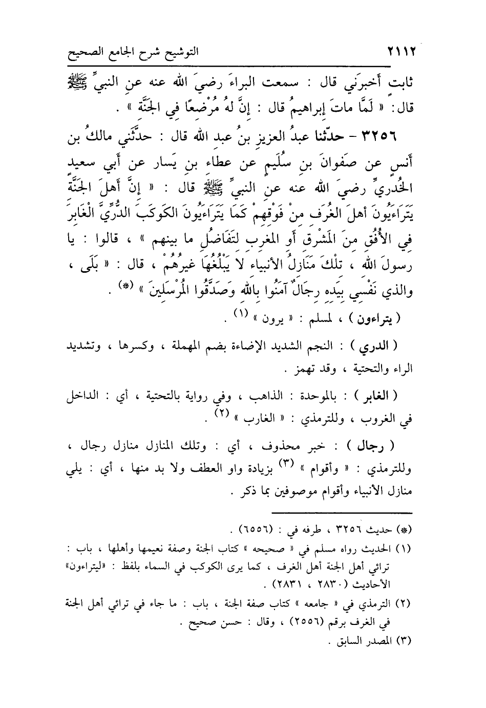 3256 - حَدَّثَنَا عَبْدُ العَزِيزِ بْنُ عَبْدِ اللَّهِ، قَالَ: حَدَّثَنِي مَالِكُ بْنُ أَنَسٍ، عَنْ صَفْوَانَ بْنِ سُلَيْمٍ، عَنْ عَطَاءِ بْنِ يَسَارٍ، عَنْ أَبِي سَعِيدٍ الخُدْرِيِّ رَضِيَ اللَّهُ عَنْهُ، عَنِ النَّبِيِّ صَلَّى اللهُ عَلَيْهِ وَسَلَّمَ، قَالَ: «إِنَّ أَهْلَ الجَنَّةِ يَتَرَاءَوْنَ أَهْلَ الغُرَفِ مِنْ فَوْقِهِمْ، كَمَا يَتَرَاءَوْنَ الكَوْكَبَ الدُّرِّيَّ الغَابِرَ فِي الأُفُقِ، مِنَ المَشْرِقِ أَوِ المَغْرِبِ، لِتَفَاضُلِ مَا بَيْنَهُمْ» قَالُوا يَا رَسُولَ اللَّهِ تِلْكَ مَنَازِلُ الأَنْبِيَاءِ لاَ يَبْلُغُهَا غَيْرُهُمْ، قَالَ: «بَلَى وَالَّذِي نَفْسِي بِيَدِهِ، رِجَالٌ آمَنُوا بِاللَّهِ وَصَدَّقُوا المُرْسَلِينَ».