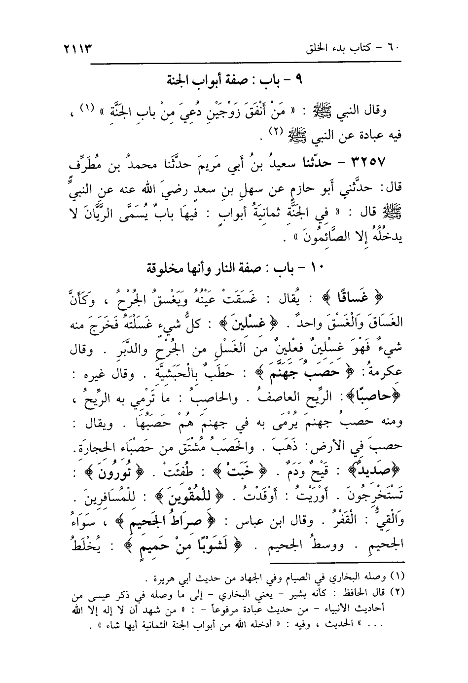 3257 - حَدَّثَنَا سَعِيدُ بْنُ أَبِي مَرْيَمَ، حَدَّثَنَا مُحَمَّدُ بْنُ مُطَرِّفٍ، قَالَ: حَدَّثَنِي أَبُو حَازِمٍ، عَنْ سَهْلِ بْنِ سَعْدٍ رَضِيَ اللَّهُ عَنْهُ، عَنِ النَّبِيِّ صَلَّى اللهُ عَلَيْهِ وَسَلَّمَ، قَالَ: «فِي الجَنَّةِ ثَمَانِيَةُ أَبْوَابٍ، فِيهَا بَابٌ يُسَمَّى الرَّيَّانَ، لاَ يَدْخُلُهُ إِلَّا الصَّائِمُونَ».