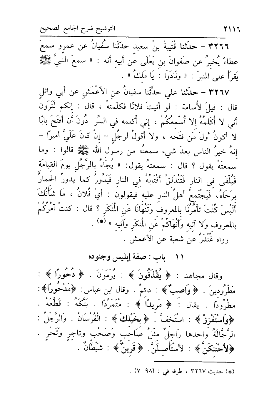 3267 - حَدَّثَنَا عَلِيٌّ، حَدَّثَنَا سُفْيَانُ، عَنِ الأَعْمَشِ، عَنْ أَبِي وَائِلٍ، قَالَ قِيلَ لِأُسَامَةَ لَوْ أَتَيْتَ فُلاَنًا فَكَلَّمْتَهُ، قَالَ: إِنَّكُمْ لَتُرَوْنَ أَنِّي لاَ أُكَلِّمُهُ إِلَّا أُسْمِعُكُمْ، إِنِّي أُكَلِّمُهُ فِي السِّرِّ دُونَ أَنْ أَفْتَحَ بَابًا لاَ أَكُونُ أَوَّلَ مَنْ فَتَحَهُ، وَلاَ أَقُولُ لِرَجُلٍ أَنْ كَانَ عَلَيَّ أَمِيرًا إِنَّهُ خَيْرُ النَّاسِ، بَعْدَ شَيْءٍ سَمِعْتُهُ مِنْ رَسُولِ اللَّهِ صَلَّى اللهُ عَلَيْهِ وَسَلَّمَ، قَالُوا: وَمَا سَمِعْتَهُ يَقُولُ: قَالَ: سَمِعْتُهُ يَقُولُ: " يُجَاءُ بِالرَّجُلِ يَوْمَ القِيَامَةِ فَيُلْقَى فِي النَّارِ، فَتَنْدَلِقُ أَقْتَابُهُ فِي النَّارِ، فَيَدُورُ كَمَا يَدُورُ الحِمَارُ بِرَحَاهُ، فَيَجْتَمِعُ أَهْلُ النَّارِ عَلَيْهِ فَيَقُولُونَ: أَيْ فُلاَنُ مَا شَأْنُكَ؟ أَلَيْسَ كُنْتَ تَأْمُرُنَا بِالْمَعْرُوفِ وَتَنْهَانَا عَنِ المُنْكَرِ؟ قَالَ: كُنْتُ آمُرُكُمْ بِالْمَعْرُوفِ وَلاَ آتِيهِ، وَأَنْهَاكُمْ عَنِ المُنْكَرِ وَآتِيهِ " رَوَاهُ غُنْدَرٌ، عَنْ شُعْبَةَ، عَنِ الأَعْمَشِ.