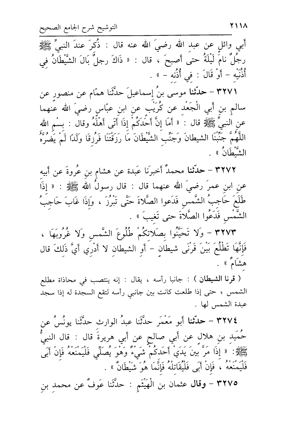 3273 - وَلاَ تَحَيَّنُوا بِصَلاَتِكُمْ طُلُوعَ الشَّمْسِ وَلاَ غُرُوبَهَا، فَإِنَّهَا تَطْلُعُ بَيْنَ قَرْنَيْ شَيْطَانٍ، أَوِ الشَّيْطَانِ» لاَ أَدْرِي أَيَّ ذَلِكَ، قَالَ هِشَامٌ.