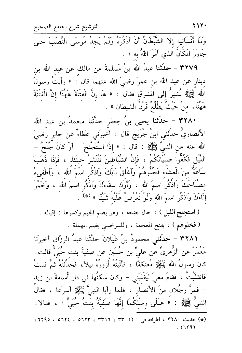 3280 - حَدَّثَنَا يَحْيَى بْنُ جَعْفَرٍ، حَدَّثَنَا مُحَمَّدُ بْنُ عَبْدِ اللَّهِ الأَنْصَارِيُّ، حَدَّثَنَا ابْنُ جُرَيْجٍ، قَالَ: أَخْبَرَنِي عَطَاءٌ، عَنْ جَابِرٍ رَضِيَ اللَّهُ عَنْهُ، عَنِ النَّبِيِّ صَلَّى اللهُ عَلَيْهِ وَسَلَّمَ، قَالَ: " إِذَا اسْتَجْنَحَ اللَّيْلُ، أَوْ قَالَ: جُنْحُ اللَّيْلِ، فَكُفُّوا صِبْيَانَكُمْ، فَإِنَّ الشَّيَاطِينَ تَنْتَشِرُ حِينَئِذٍ، فَإِذَا ذَهَبَ سَاعَةٌ مِنَ العِشَاءِ فَخَلُّوهُمْ، وَأَغْلِقْ بَابَكَ وَاذْكُرِ اسْمَ اللَّهِ، وَأَطْفِئْ مِصْبَاحَكَ وَاذْكُرِ اسْمَ اللَّهِ، وَأَوْكِ سِقَاءَكَ وَاذْكُرِ اسْمَ اللَّهِ، وَخَمِّرْ إِنَاءَكَ وَاذْكُرِ اسْمَ اللَّهِ، وَلَوْ تَعْرُضُ عَلَيْهِ شَيْئًا".