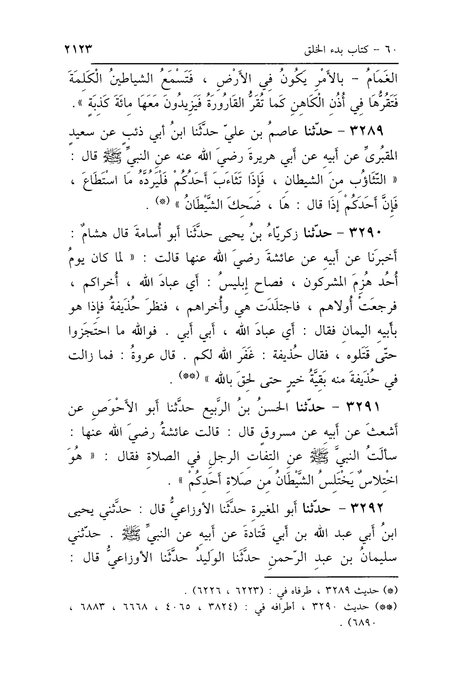 3290 - حَدَّثَنَا زَكَرِيَّاءُ بْنُ يَحْيَى، حَدَّثَنَا أَبُو أُسَامَةَ، قَالَ: هِشَامٌ أَخْبَرَنَا، عَنْ أَبِيهِ، عَنْ عَائِشَةَ رَضِيَ اللَّهُ عَنْهَا، قَالَتْ: " لَمَّا كَانَ يَوْمَ أُحُدٍ هُزِمَ المُشْرِكُونَ، فَصَاحَ إِبْلِيسُ: أَيْ عِبَادَ اللَّهِ أُخْرَاكُمْ، فَرَجَعَتْ أُولاَهُمْ فَاجْتَلَدَتْ هِيَ وَأُخْرَاهُمْ، فَنَظَرَ حُذَيْفَةُ فَإِذَا هُوَ بِأَبِيهِ اليَمَانِ، فَقَالَ: أَيْ عِبَادَ اللَّهِ أَبِي أَبِي، فَوَاللَّهِ مَا احْتَجَزُوا حَتَّى قَتَلُوهُ، فَقَالَ: حُذَيْفَةُ غَفَرَ اللَّهُ لَكُمْ، قَالَ عُرْوَةُ فَمَا زَالَتْ فِي حُذَيْفَةَ مِنْهُ بَقِيَّةُ خَيْرٍ حَتَّى لَحِقَ بِاللَّهِ".