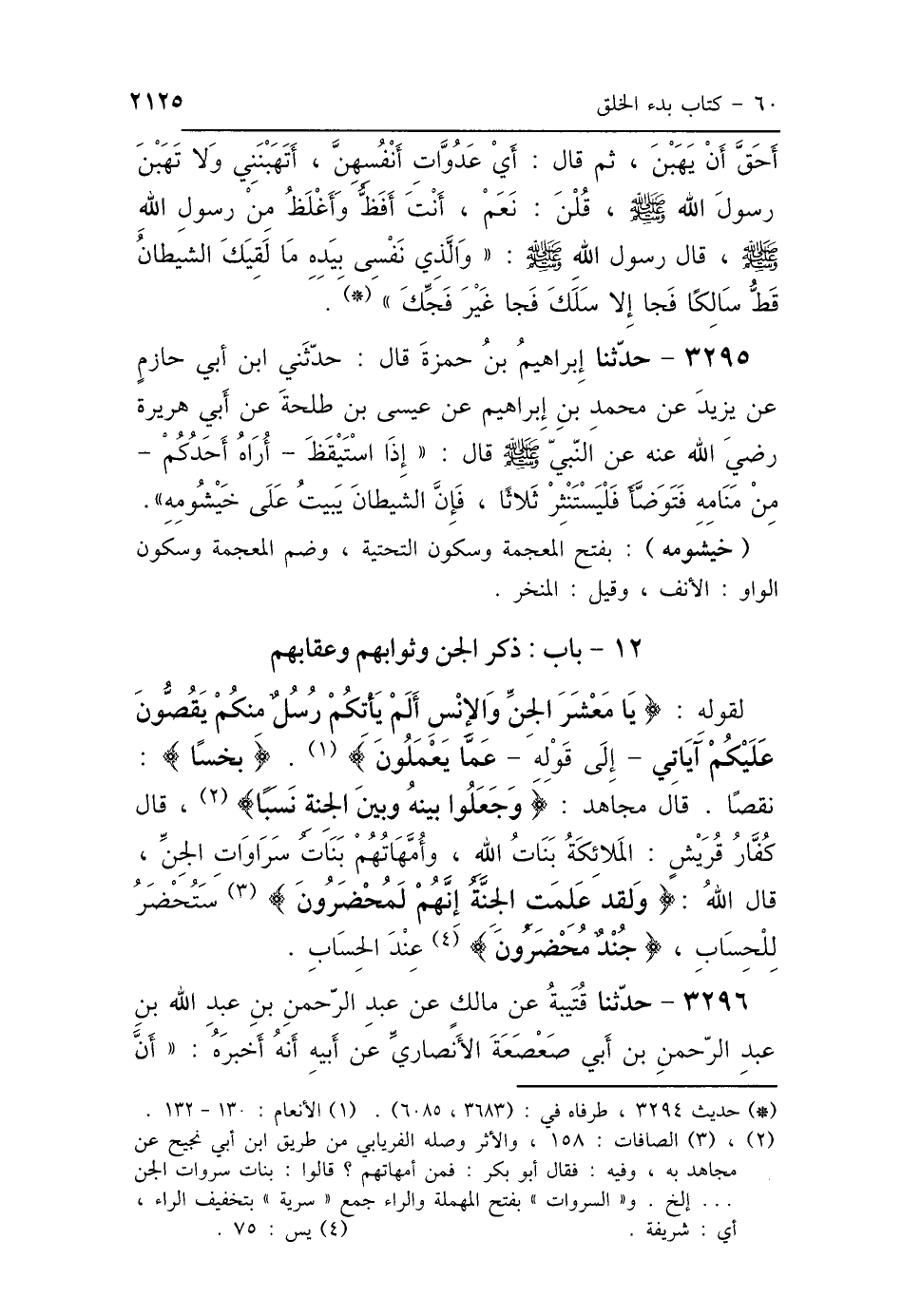 لِقَوْلِهِ {يَا مَعْشَرَ الجِنِّ وَالإِنْسِ أَلَمْ يَأْتِكُمْ رُسُلٌ مِنْكُمْ يَقُصُّونَ عَلَيْكُمْ آيَاتِي} [الأنعام: 130]- إِلَى قَوْلِهِ - {عَمَّا يَعْمَلُونَ} [البقرة: 144] {بَخْسًا} [الجن: 13]: «نَقْصًا» قَالَ مُجَاهِدٌ: {وَجَعَلُوا بَيْنَهُ وَبَيْنَ الجِنَّةِ نَسَبًا} [الصافات: 158] قَالَ: " كُفَّارُ قُرَيْشٍ: المَلاَئِكَةُ بَنَاتُ اللَّهِ، وَأُمَّهَاتُهُنَّ بَنَاتُ سَرَوَاتِ الجِنِّ "، قَالَ اللَّهُ: {وَلَقَدْ عَلِمَتِ الجِنَّةُ إِنَّهُمْ لَمُحْضَرُونَ} [الصافات: 158]: «سَتُحْضَرُ لِلْحِسَابِ»، {جُنْدٌ مُحْضَرُونَ} [يس: 75]: «عِنْدَ الحِسَابِ».