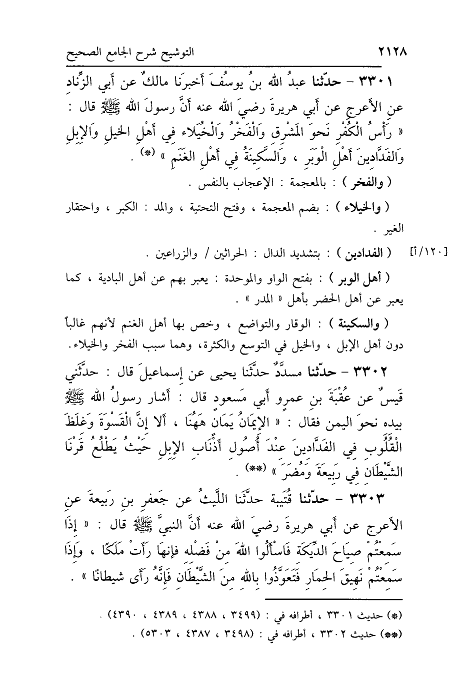 3301 - حَدَّثَنَا عَبْدُ اللَّهِ بْنُ يُوسُفَ، أَخْبَرَنَا مَالِكٌ، عَنْ أَبِي الزِّنَادِ، عَنِ الأَعْرَجِ، عَنْ أَبِي هُرَيْرَةَ رَضِيَ اللَّهُ عَنْهُ، أَنَّ رَسُولَ اللَّهِ صَلَّى اللهُ عَلَيْهِ وَسَلَّمَ، قَالَ: «رَأْسُ الكُفْرِ نَحْوَ المَشْرِقِ، وَالفَخْرُ وَالخُيَلاَءُ فِي أَهْلِ الخَيْلِ وَالإِبِلِ، وَالفَدَّادِينَ أَهْلِ الوَبَرِ، وَالسَّكِينَةُ فِي أَهْلِ الغَنَمِ».