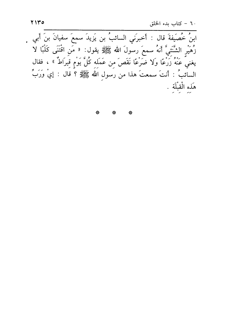 بْنُ خُصَيْفَةَ، قَالَ: أَخْبَرَنِي السَّائِبُ بْنُ يَزِيدَ، سَمِعَ سُفْيَانَ بْنَ أَبِي زُهَيْرٍ الشَّنَئِيَّ، أَنَّهُ سَمِعَ رَسُولَ اللَّهِ صَلَّى اللهُ عَلَيْهِ وَسَلَّمَ، يَقُولُ «مَنِ اقْتَنَى كَلْبًا، لاَ يُغْنِي عَنْهُ زَرْعًا وَلاَ ضَرْعًا، نَقَصَ مِنْ عَمَلِهِ كُلَّ يَوْمٍ قِيرَاطٌ» فَقَالَ السَّائِبُ: أَنْتَ سَمِعْتَ هَذَا مِنْ رَسُولِ اللَّهِ صَلَّى اللهُ عَلَيْهِ وَسَلَّمَ، قَالَ: إِي وَرَبِّ هَذِهِ القِبْلَةِ.