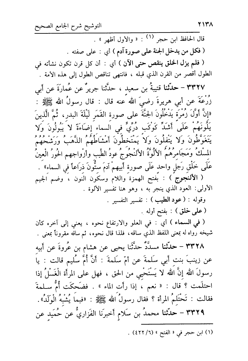 3327 - حَدَّثَنَا قُتَيْبَةُ بْنُ سَعِيدٍ، حَدَّثَنَا جَرِيرٌ، عَنْ عُمَارَةَ، عَنْ أَبِي زُرْعَةَ، عَنْ أَبِي هُرَيْرَةَ رَضِيَ اللَّهُ عَنْهُ، قَالَ: قَالَ رَسُولُ اللَّهِ صَلَّى اللهُ عَلَيْهِ وَسَلَّمَ: «إِنَّ أَوَّلَ زُمْرَةٍ يَدْخُلُونَ الجَنَّةَ عَلَى صُورَةِ القَمَرِ لَيْلَةَ البَدْرِ، ثُمَّ الَّذِينَ يَلُونَهُمْ عَلَى أَشَدِّ كَوْكَبٍ دُرِّيٍّ فِي السَّمَاءِ إِضَاءَةً، لاَ يَبُولُونَ وَلاَ يَتَغَوَّطُونَ، وَلاَ يَتْفِلُونَ وَلاَ يَمْتَخِطُونَ، أَمْشَاطُهُمُ الذَّهَبُ، وَرَشْحُهُمُ المِسْكُ، وَمَجَامِرُهُمْ الأَلُوَّةُ الأَنْجُوجُ، عُودُ الطِّيبِ وَأَزْوَاجُهُمُ الحُورُ العِينُ، عَلَى خَلْقِ رَجُلٍ وَاحِدٍ، عَلَى صُورَةِ أَبِيهِمْ آدَمَ، سِتُّونَ ذِرَاعًا فِي السَّمَاءِ».