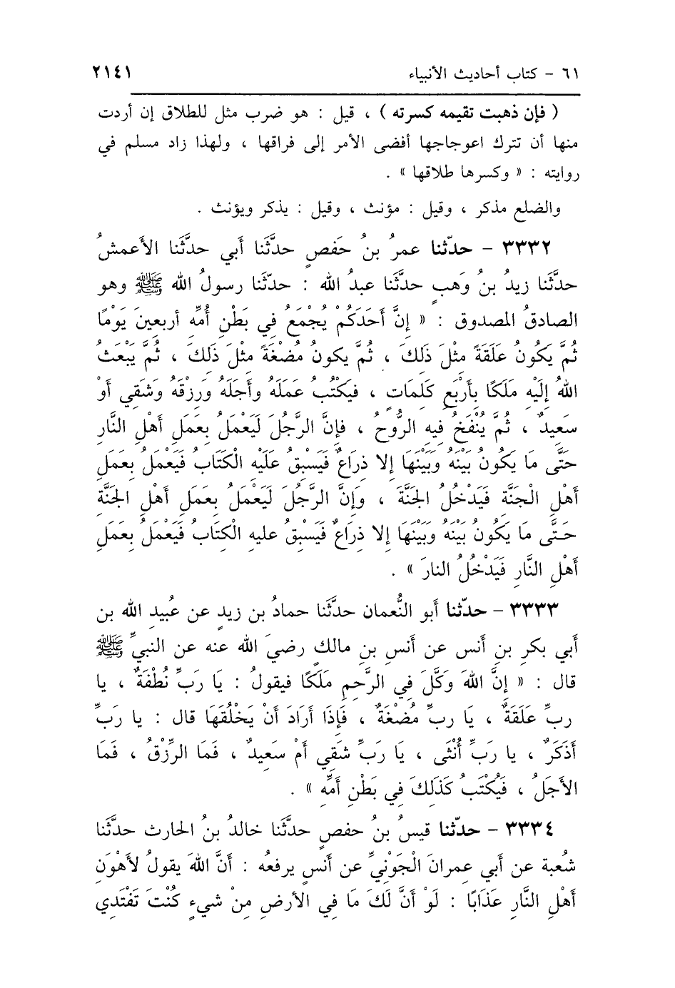 3332 - حَدَّثَنَا عُمَرُ بْنُ حَفْصٍ، حَدَّثَنَا أَبِي، حَدَّثَنَا الأَعْمَشُ، حَدَّثَنَا زَيْدُ بْنُ وَهْبٍ، حَدَّثَنَا عَبْدُ اللَّهِ، حَدَّثَنَا رَسُولُ اللَّهِ صَلَّى اللهُ عَلَيْهِ وَسَلَّمَ وَهُوَ الصَّادِقُ المَصْدُوقُ، «إِنَّ أَحَدَكُمْ يُجْمَعُ فِي بَطْنِ أُمِّهِ أَرْبَعِينَ يَوْمًا، ثُمَّ يَكُونُ عَلَقَةً مِثْلَ ذَلِكَ، ثُمَّ يَكُونُ مُضْغَةً مِثْلَ ذَلِكَ، ثُمَّ يَبْعَثُ اللَّهُ إِلَيْهِ مَلَكًا بِأَرْبَعِ كَلِمَاتٍ، فَيُكْتَبُ عَمَلُهُ، وَأَجَلُهُ، وَرِزْقُهُ، وَشَقِيٌّ أَوْ سَعِيدٌ، ثُمَّ يُنْفَخُ فِيهِ الرُّوحُ، فَإِنَّ الرَّجُلَ لَيَعْمَلُ بِعَمَلِ أَهْلِ النَّارِ، حَتَّى مَا يَكُونُ بَيْنَهُ وَبَيْنَهَا إِلَّا ذِرَاعٌ، فَيَسْبِقُ عَلَيْهِ الكِتَابُ فَيَعْمَلُ بِعَمَلِ أَهْلِ الجَنَّةِ فَيَدْخُلُ الجَنَّةَ، وَإِنَّ الرَّجُلَ لَيَعْمَلُ بِعَمَلِ أَهْلِ الجَنَّةِ، حَتَّى مَا يَكُونُ بَيْنَهُ وَبَيْنَهَا إِلَّا ذِرَاعٌ، فَيَسْبِقُ عَلَيْهِ الكِتَابُ، فَيَعْمَلُ بِعَمَلِ أَهْلِ النَّارِ، فَيَدْخُلُ النَّارَ».