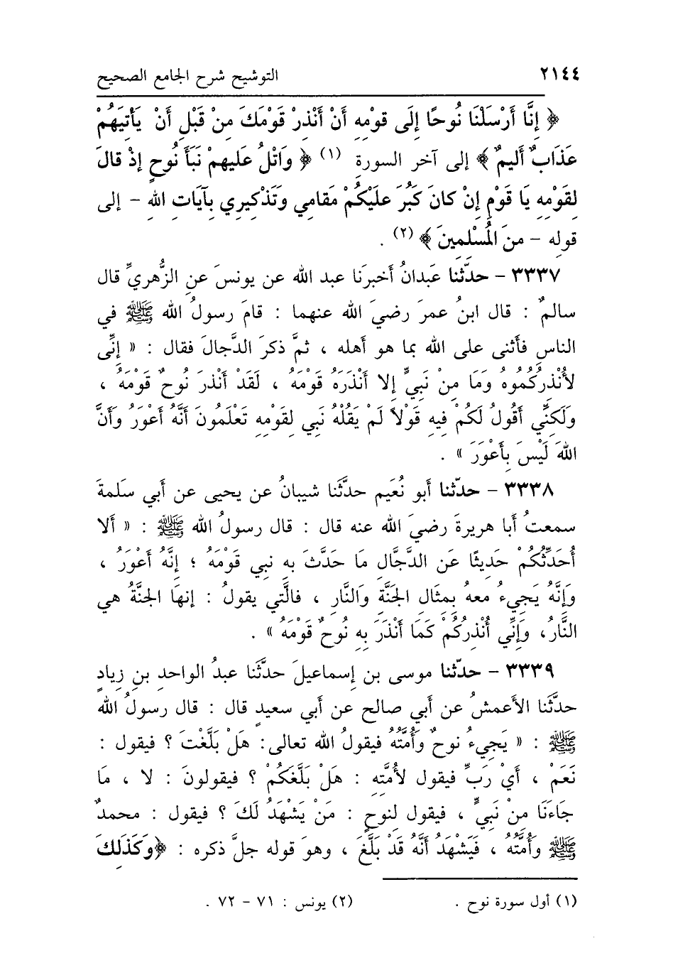 3337 - حَدَّثَنَا عَبْدَانُ، أَخْبَرَنَا عَبْدُ اللَّهِ، عَنْ يُونُسَ، عَنِ الزُّهْرِيِّ، قَالَ سَالِمٌ:، وَقَالَ ابْنُ عُمَرَ رَضِيَ اللَّهُ عَنْهُمَا: قَامَ رَسُولُ اللَّهِ صَلَّى اللهُ عَلَيْهِ وَسَلَّمَ فِي النَّاسِ فَأَثْنَى عَلَى اللَّهِ بِمَا هُوَ أَهْلُهُ ثُمَّ ذَكَرَ الدَّجَّالَ فَقَالَ: " إِنِّي لَأُنْذِرُكُمُوهُ، وَمَا مِنْ نَبِيٍّ إِلَّا أَنْذَرَهُ قَوْمَهُ، لَقَدْ أَنْذَرَ نُوحٌ قَوْمَهُ، وَلَكِنِّي أَقُولُ لَكُمْ فِيهِ قَوْلًا لَمْ يَقُلْهُ نَبِيٌّ لِقَوْمِهِ: تَعْلَمُونَ أَنَّهُ أَعْوَرُ، وَأَنَّ اللَّهَ لَيْسَ بِأَعْوَرَ".