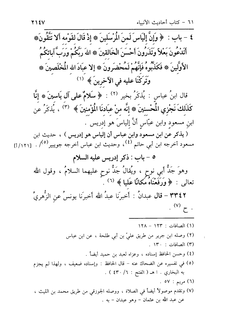 قَالَ ابْنُ عَبَّاسٍ «يُذْكَرُ بِخَيْرٍ (سَلاَمٌ عَلَى آلِ يَاسِينَ إِنَّا كَذَلِكَ نَجْزِي المُحْسِنِينَ إِنَّهُ مِنْ عِبَادِنَا المُؤْمِنِينَ)» يُذْكَرُ عَنْ ابْنِ مَسْعُودٍ وَابْنِ عَبَّاسٍ أَنَّ إِلْيَاسَ هُوَ إِدْرِيسُ.