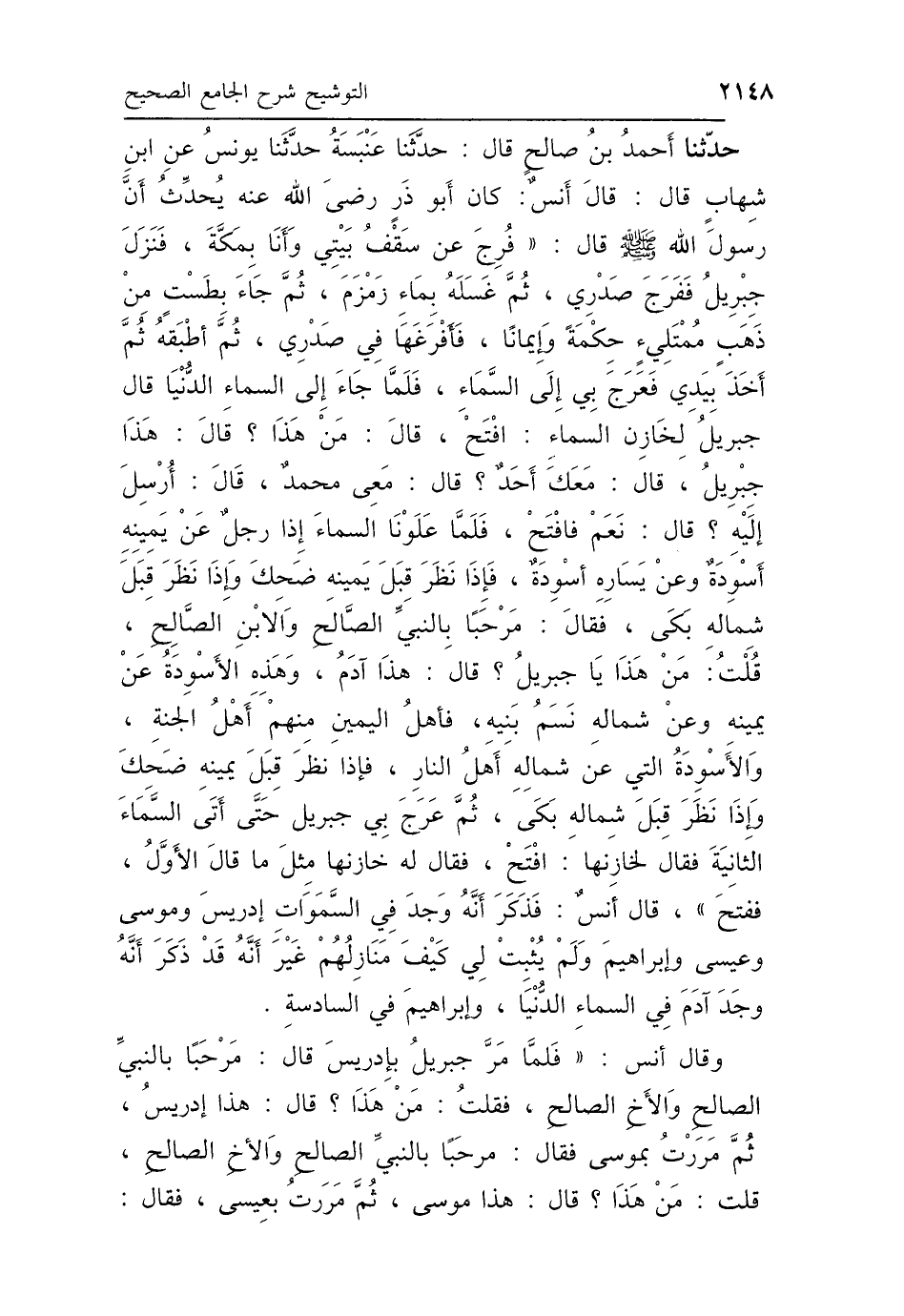 حَدَّثَنَا أَحْمَدُ بْنُ صَالِحٍ، حَدَّثَنَا عَنْبَسَةُ، حَدَّثَنَا يُونُسُ، عَنِ ابْنِ شِهَابٍ، قَالَ: قَالَ أَنَسُ بْنُ مَالِكٍ كَانَ أَبُو ذَرٍّ رَضِيَ اللَّهُ عَنْهُ يُحَدِّثُ أَنَّ رَسُولَ اللَّهِ صَلَّى اللهُ عَلَيْهِ وَسَلَّمَ قَالَ " فُرِجَ سَقْفُ بَيْتِي وَأَنَا بِمَكَّةَ، فَنَزَلَ جِبْرِيلُ فَفَرَجَ صَدْرِي، ثُمَّ غَسَلَهُ بِمَاءِ زَمْزَمَ، ثُمَّ جَاءَ بِطَسْتٍ مِنْ ذَهَبٍ، مُمْتَلِئٍ حِكْمَةً وَإِيمَانًا، فَأَفْرَغَهَا فِي صَدْرِي، ثُمَّ أَطْبَقَهُ، ثُمَّ أَخَذَ بِيَدِي فَعَرَجَ بِي إِلَى السَّمَاءِ، فَلَمَّا جَاءَ إِلَى السَّمَاءِ الدُّنْيَا قَالَ جِبْرِيلُ لِخَازِنِ السَّمَاءِ: افْتَحْ، قَالَ مَنْ هَذَا؟ قَالَ هَذَا جِبْرِيلُ قَالَ: مَعَكَ أَحَدٌ قَالَ: مَعِي مُحَمَّدٌ، قَالَ أُرْسِلَ إِلَيْهِ؟ قَالَ: نَعَمْ فَافْتَحْ، فَلَمَّا عَلَوْنَا السَّمَاءَ الدُّنْيَا إِذَا رَجُلٌ عَنْ يَمِينِهِ أَسْوِدَةٌ، وَعَنْ يَسَارِهِ أَسْوِدَةٌ، فَإِذَا نَظَرَ قِبَلَ يَمِينِهِ ضَحِكَ، وَإِذَا نَظَرَ قِبَلَ شِمَالِهِ بَكَى، فَقَالَ: مَرْحَبًا بِالنَّبِيِّ الصَّالِحِ وَالِابْنِ الصَّالِحِ، قُلْتُ مَنْ هَذَا يَا جِبْرِيلُ؟ قَالَ: هَذَا آدَمُ وَهَذِهِ الأَسْوِدَةُ عَنْ يَمِينِهِ، وَعَنْ شِمَالِهِ نَسَمُ بَنِيهِ، فَأَهْلُ اليَمِينِ مِنْهُمْ أَهْلُ الجَنَّةِ، وَالأَسْوِدَةُ الَّتِي عَنْ شِمَالِهِ أَهْلُ النَّارِ، فَإِذَا نَظَرَ قِبَلَ يَمِينِهِ ضَحِكَ، وَإِذَا نَظَرَ قِبَلَ شِمَالِهِ بَكَى، ثُمَّ عَرَجَ بِي جِبْرِيلُ حَتَّى أَتَى السَّمَاءَ الثَّانِيَةَ، فَقَالَ لِخَازِنِهَا: افْتَحْ، فَقَالَ لَهُ خَازِنُهَا مِثْلَ مَا قَالَ الأَوَّلُ فَفَتَحَ " قَالَ أَنَسٌ: فَذَكَرَ أَنَّهُ وَجَدَ فِي السَّمَوَاتِ إِدْرِيسَ، وَمُوسَى، وَعِيسَى، وَإِبْرَاهِيمَ وَلَمْ يُثْبِتْ لِي كَيْفَ مَنَازِلُهُمْ، غَيْرَ أَنَّهُ قَدْ ذَكَرَ: أَنَّهُ وَجَدَ آدَمَ فِي السَّمَاءِ الدُّنْيَا، وَإِبْرَاهِيمَ فِي السَّادِسَةِ، وَقَالَ أَنَسٌ: فَلَمَّا مَرَّ جِبْرِيلُ بِإِدْرِيسَ قَالَ: مَرْحَبًا بِالنَّبِيِّ الصَّالِحِ وَالأَخِ الصَّالِحِ، فَقُلْتُ مَنْ هَذَا قَالَ هَذَا إِدْرِيسُ، ثُمَّ مَرَرْتُ بِمُوسَى فَقَالَ: مَرْحَبًا بِالنَّبِيِّ الصَّالِحِ وَالأَخِ الصَّالِحِ، قُلْتُ مَنْ هَذَا قَالَ هَذَا مُوسَى، ثُمَّ مَرَرْتُ بِعِيسَى فَقَالَ: