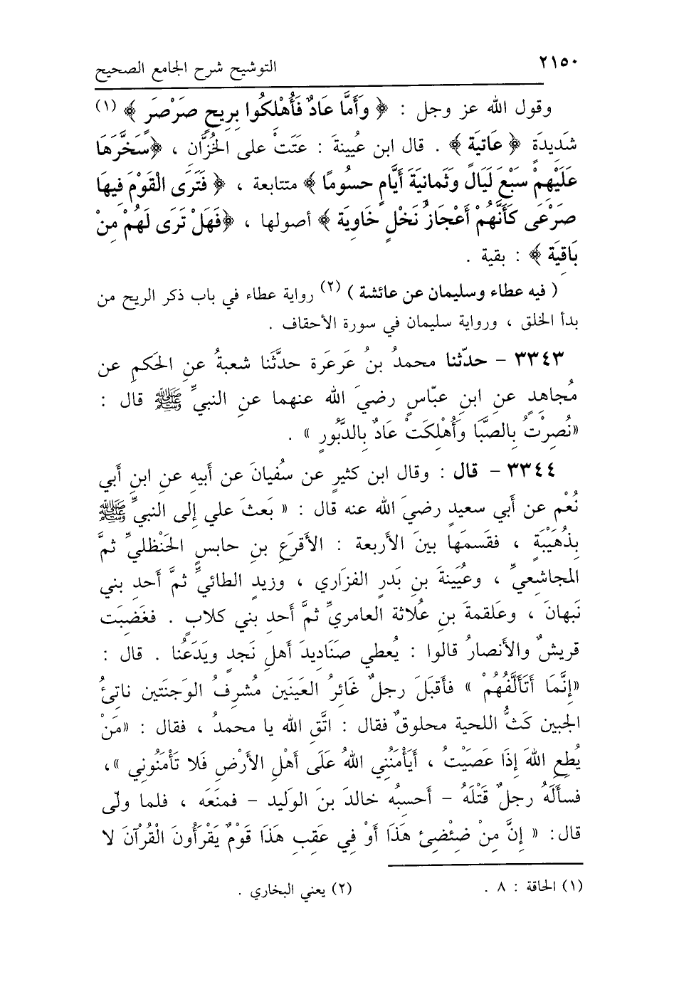 (فيه عطاء وسليمان عن عائشة) (2) رواية عطاء في باب ذكر الريح من بدأ الخلق، ورواية سليمان في سورة الأحقاف.