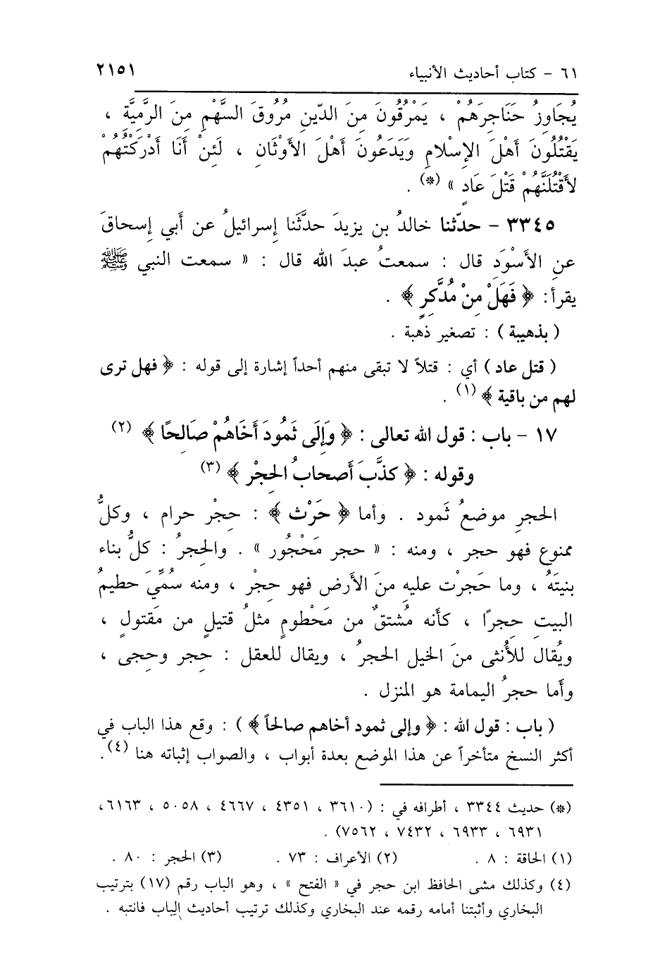 (باب: قول الله: {وإلى ثمود أخاهم صالحًا}): وقع هذا الباب في أكثر النسخ متأخرًا عن هذا الموضع بعدة أبواب، والصواب إثباته هنا.