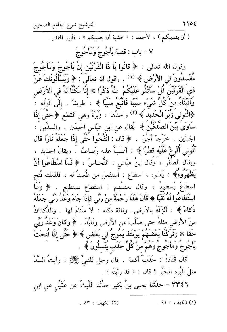 وَقَوْلِ اللَّهِ تَعَالَى: قَالُوا {يَا ذَا القَرْنَيْنِ إِنَّ يَأْجُوجَ، وَمَأْجُوجَ مُفْسِدُونَ فِي الأَرْضِ} [الكهف: 94] قَوْلُ اللَّهِ تَعَالَى {وَيَسْأَلُونَكَ عَنْ ذِي القَرْنَيْنِ قُلْ سَأَتْلُو عَلَيْكُمْ مِنْهُ ذِكْرًا. إِنَّا مَكَّنَّا لَهُ فِي الأَرْضِ وَآتَيْنَاهُ مِنْ كُلِّ شَيْءٍ سَبَبًا} [الكهف: 84]. (فَاتَّبَعَ سَبَبًا) - إِلَى قَوْلِهِ - (ائْتُونِي زُبَرَ الحَدِيدِ): «وَاحِدُهَا زُبْرَةٌ وَهِيَ القِطَعُ» {حَتَّى إِذَا سَاوَى بَيْنَ الصَّدَفَيْنِ} [الكهف: 96] يُقَالُ عَنْ ابْنِ عَبَّاسٍ: الجَبَلَيْنِ، وَالسُّدَّيْنِ الجَبَلَيْنِ {خَرْجًا} [الكهف: 94]: «أَجْرًا»، {قَالَ انْفُخُوا حَتَّى إِذَا جَعَلَهُ نَارًا قَالَ آتُونِي أُفْرِغْ عَلَيْهِ قِطْرًا} [الكهف: 96]: " أَصْبُبْ عَلَيْهِ رَصَاصًا، وَيُقَالُ الحَدِيدُ، وَيُقَالُ: الصُّفْرُ " وَقَالَ ابْنُ عَبَّاسٍ: «النُّحَاسُ» {فَمَا اسْطَاعُوا أَنْ يَظْهَرُوهُ} [الكهف: 97] " يَعْلُوهُ، اسْتَطَاعَ اسْتَفْعَلَ، مِنْ أَطَعْتُ لَهُ، فَلِذَلِكَ فُتِحَ أَسْطَاعَ يَسْطِيعُ، وَقَالَ بَعْضُهُمْ: اسْتَطَاعَ يَسْتَطِيعُ "، وَمَا اسْتَطَاعُوا لَهُ نَقْبًا. (قَالَ هَذَا رَحْمَةٌ مِنْ رَبِّي فَإِذَا جَاءَ وَعْدُ رَبِّي جَعَلَهُ دَكًّا): أَلْزَقَهُ بِالأَرْضِ، وَنَاقَةٌ دَكَّاءُ لاَ سَنَامَ لَهَا، وَالدَّكْدَاكُ مِنَ الأَرْضِ مِثْلُهُ، حَتَّى صَلُبَ وَتَلَبَّدَ، {وَكَانَ وَعْدُ رَبِّي حَقًّا. وَتَرَكْنَا بَعْضَهُمْ يَوْمَئِذٍ يَمُوجُ فِي بَعْضٍ} [الكهف: 98] {حَتَّى إِذَا فُتِحَتْ يَأْجُوجُ وَمَأْجُوجُ وَهُمْ مِنْ كُلِّ حَدَبٍ يَنْسِلُونَ} [الأنبياء: 96] قَالَ قَتَادَةُ: " حَدَبٌ: أَكَمَةٌ " قَالَ رَجُلٌ لِلنَّبِيِّ صَلَّى اللهُ عَلَيْهِ وَسَلَّمَ: رَأَيْتُ السَّدَّ مِثْلَ البُرْدِ المُحَبَّرِ، قَالَ: «رَأَيْتَهُ».