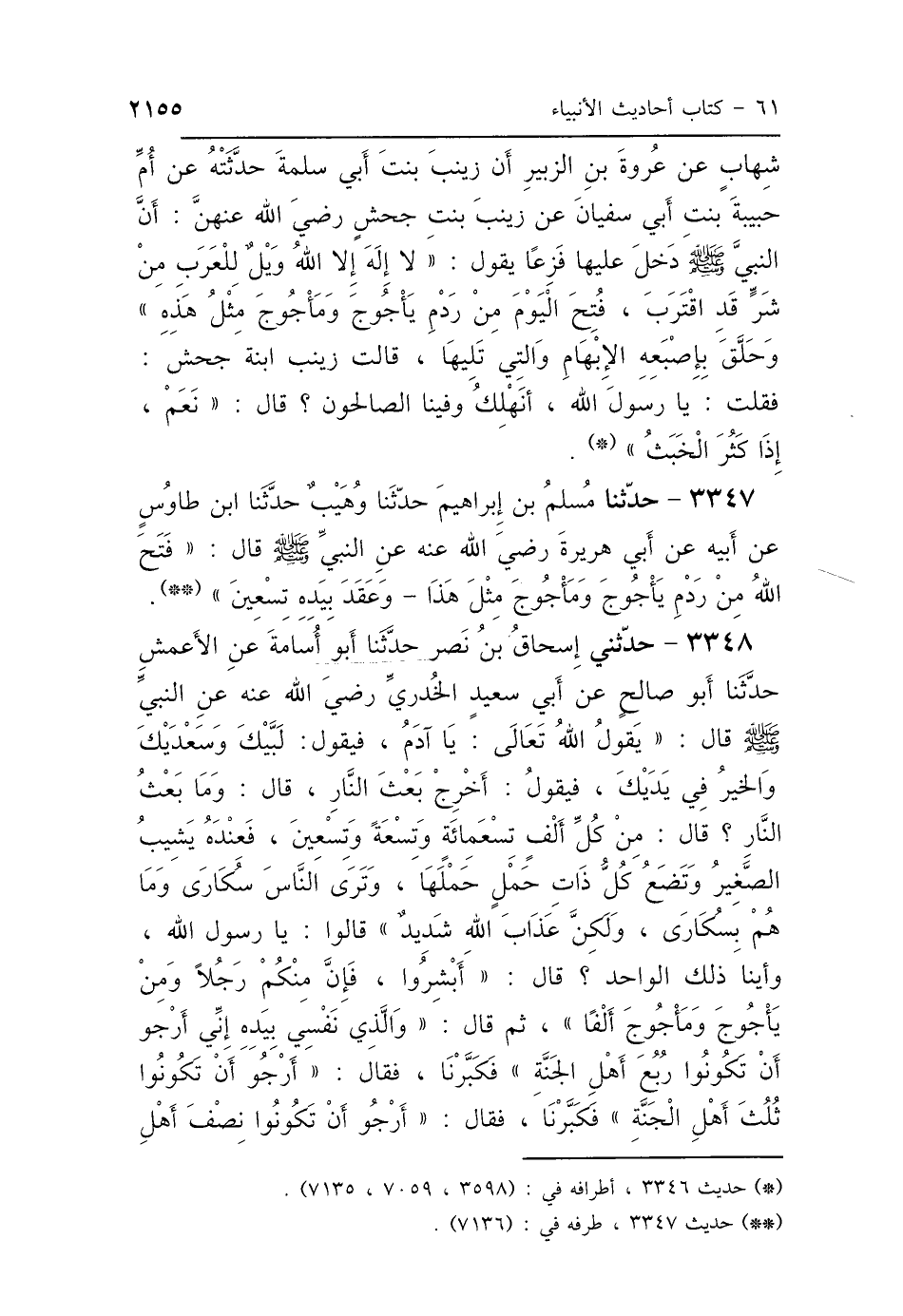 3348 - حَدَّثَنِي إِسْحَاقُ بْنُ نَصْرٍ، حَدَّثَنَا أَبُو أُسَامَةَ، عَنِ الأَعْمَشِ، حَدَّثَنَا أَبُو صَالِحٍ، عَنْ أَبِي سَعِيدٍ الخُدْرِيِّ رَضِيَ اللَّهُ عَنْهُ، عَنِ النَّبِيِّ صَلَّى اللهُ عَلَيْهِ وَسَلَّمَ، قَالَ: " يَقُولُ اللَّهُ تَعَالَى: " يَا آدَمُ، فَيَقُولُ: لَبَّيْكَ وَسَعْدَيْكَ، وَالخَيْرُ فِي يَدَيْكَ، فَيَقُولُ: أَخْرِجْ بَعْثَ النَّارِ، قَالَ: وَمَا بَعْثُ النَّارِ؟، قَالَ: مِنْ كُلِّ أَلْفٍ تِسْعَ مِائَةٍ وَتِسْعَةً وَتِسْعِينَ، فَعِنْدَهُ يَشِيبُ الصَّغِيرُ، وَتَضَعُ كُلُّ ذَاتِ حَمْلٍ حَمْلَهَا، وَتَرَى النَّاسَ سُكَارَى وَمَا هُمْ بِسُكَارَى، وَلَكِنَّ عَذَابَ اللَّهِ شَدِيدٌ " قَالُوا: يَا رَسُولَ اللَّهِ، وَأَيُّنَا ذَلِكَ الوَاحِدُ؟ قَالَ: "أَبْشِرُوا، فَإِنَّ مِنْكُمْ رَجُلًا وَمِنْ يَأْجُوجَ وَمَأْجُوجَ أَلْفًا. ثُمَّ قَالَ: وَالَّذِي نَفْسِي بِيَدِهِ، إِنِّي أَرْجُو أَنْ تَكُونُوا رُبُعَ أَهْلِ الجَنَّةِ " فَكَبَّرْنَا، فَقَالَ: «أَرْجُو أَنْ تَكُونُوا ثُلُثَ أَهْلِ الجَنَّةِ» فَكَبَّرْنَا، فَقَالَ: «أَرْجُو أَنْ تَكُونُوا نِصْفَ أَهْلِ