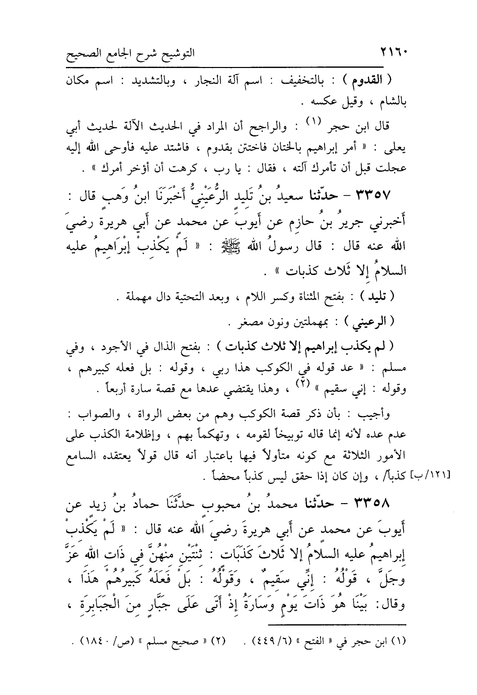 3357 - حَدَّثَنَا سَعِيدُ بْنُ تَلِيدٍ الرُّعَيْنِيُّ، أَخْبَرَنَا ابْنُ وَهْبٍ، قَالَ: أَخْبَرَنِي جَرِيرُ بْنُ حَازِمٍ، عَنْ أَيُّوبَ، عَنْ مُحَمَّدٍ، عَنْ أَبِي هُرَيْرَةَ رَضِيَ اللَّهُ عَنْهُ، قَالَ: قَالَ رَسُولُ اللَّهِ صَلَّى اللهُ عَلَيْهِ وَسَلَّمَ: «لَمْ يَكْذِبْ إِبْرَاهِيمُ إِلَّا ثَلاَثًا».