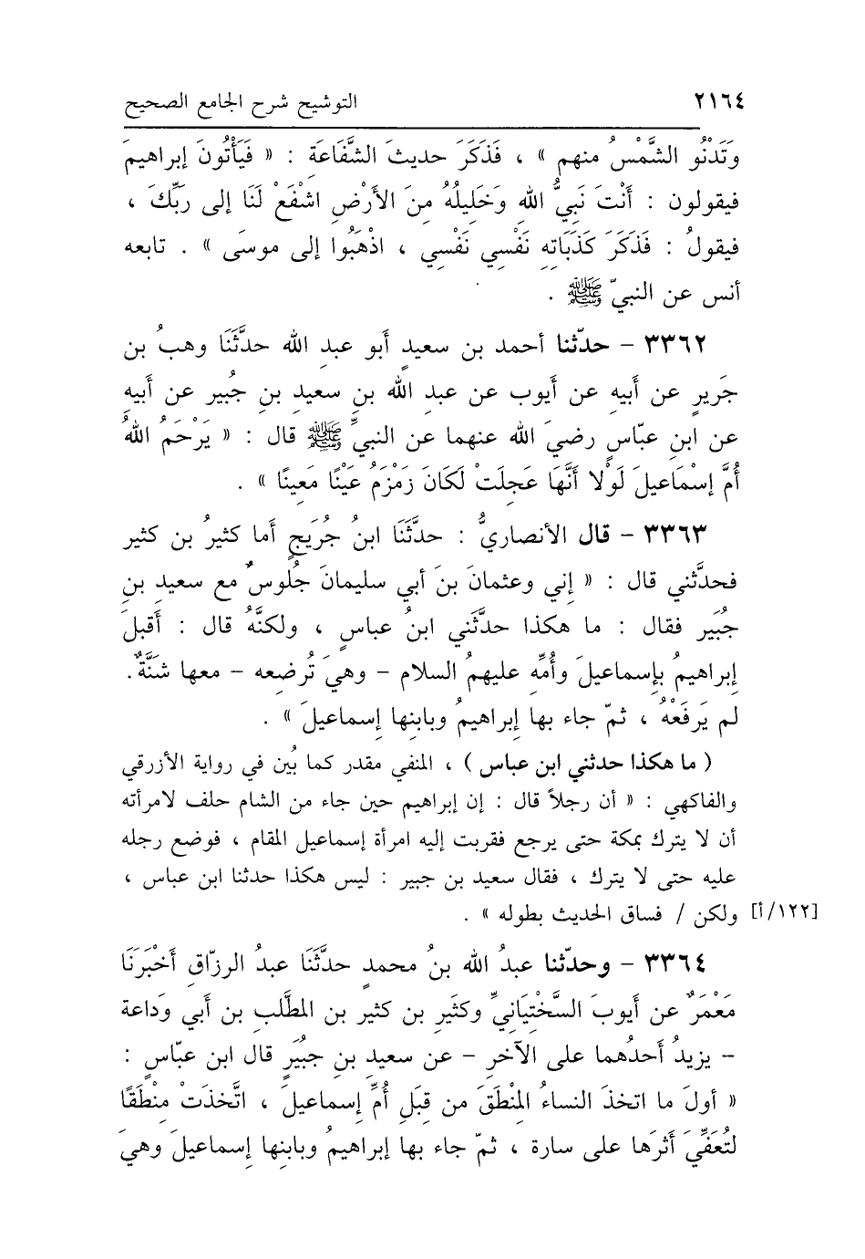 3363 - قَالَ الأَنْصَارِيُّ، حَدَّثَنَا ابْنُ جُرَيْجٍ، قَالَ: أَمَّا كَثِيرُ بْنُ كَثِيرٍ، فَحَدَّثَنِي قَالَ: إِنِّي وَعُثْمَانَ بْنَ أَبِي سُلَيْمانَ، جُلُوسٌ مَعَ سَعِيدِ بْنِ جُبَيْرٍ، فَقَالَ: مَا هَكَذَا حَدَّثَنِي ابْنُ عَبَّاسٍ، وَلَكِنَّهُ قَالَ: أَقْبَلَ إِبْرَاهِيمُ بِإِسْمَاعِيلَ وَأُمِّهِ عَلَيْهِمُ السَّلاَمُ، وَهِيَ تُرْضِعُهُ، مَعَهَا شَنَّةٌ لَمْ يَرْفَعْهُ ثُمَّ جَاءَ بِهَا إِبْرَاهِيمُ وَبِابْنِهَا إِسْمَاعِيلَ.
