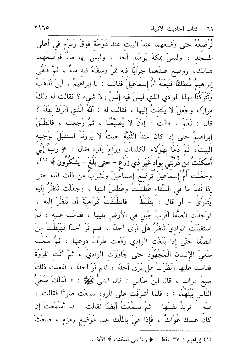 تُرْضِعُهُ، حَتَّى وَضَعَهُمَا عِنْدَ البَيْتِ عِنْدَ دَوْحَةٍ، فَوْقَ زَمْزَمَ فِي أَعْلَى المَسْجِدِ، وَلَيْسَ بِمَكَّةَ يَوْمَئِذٍ أَحَدٌ، وَلَيْسَ بِهَا مَاءٌ، فَوَضَعَهُمَا هُنَالِكَ، وَوَضَعَ عِنْدَهُمَا جِرَابًا فِيهِ تَمْرٌ، وَسِقَاءً فِيهِ مَاءٌ، ثُمَّ قَفَّى إِبْرَاهِيمُ مُنْطَلِقًا، فَتَبِعَتْهُ أُمُّ إِسْمَاعِيلَ فَقَالَتْ: يَا إِبْرَاهِيمُ، أَيْنَ تَذْهَبُ وَتَتْرُكُنَا بِهَذَا الوَادِي، الَّذِي لَيْسَ فِيهِ إِنْسٌ وَلاَ شَيْءٌ؟ فَقَالَتْ لَهُ ذَلِكَ مِرَارًا، وَجَعَلَ لاَ يَلْتَفِتُ إِلَيْهَا، فَقَالَتْ لَهُ: آللَّهُ الَّذِي أَمَرَكَ بِهَذَا؟ قَالَ نَعَمْ، قَالَتْ: إِذَنْ لاَ يُضَيِّعُنَا، ثُمَّ رَجَعَتْ، فَانْطَلَقَ إِبْرَاهِيمُ حَتَّى إِذَا كَانَ عِنْدَ الثَّنِيَّةِ حَيْثُ لاَ يَرَوْنَهُ، اسْتَقْبَلَ بِوَجْهِهِ البَيْتَ، ثُمَّ دَعَا بِهَؤُلاَءِ الكَلِمَاتِ، وَرَفَعَ يَدَيْهِ فَقَالَ: رَبِّ {إِنِّي أَسْكَنْتُ مِنْ ذُرِّيَّتِي بِوَادٍ غَيْرِ ذِي زَرْعٍ عِنْدَ بَيْتِكَ المُحَرَّمِ} [إبراهيم: 37]- حَتَّى بَلَغَ - {يَشْكُرُونَ} [إبراهيم: 37] " وَجَعَلَتْ أُمُّ إِسْمَاعِيلَ تُرْضِعُ إِسْمَاعِيلَ وَتَشْرَبُ مِنْ ذَلِكَ المَاءِ، حَتَّى إِذَا نَفِدَ مَا فِي السِّقَاءِ عَطِشَتْ وَعَطِشَ ابْنُهَا، وَجَعَلَتْ تَنْظُرُ إِلَيْهِ يَتَلَوَّى، أَوْ قَالَ يَتَلَبَّطُ، فَانْطَلَقَتْ كَرَاهِيَةَ أَنْ تَنْظُرَ إِلَيْهِ، فَوَجَدَتِ الصَّفَا أَقْرَبَ جَبَلٍ فِي الأَرْضِ يَلِيهَا، فَقَامَتْ عَلَيْهِ، ثُمَّ اسْتَقْبَلَتِ الوَادِيَ تَنْظُرُ هَلْ تَرَى أَحَدًا فَلَمْ تَرَ أَحَدًا، فَهَبَطَتْ مِنَ الصَّفَا حَتَّى إِذَا بَلَغَتِ الوَادِيَ رَفَعَتْ طَرَفَ دِرْعِهَا، ثُمَّ سَعَتْ سَعْيَ الإِنْسَانِ المَجْهُودِ حَتَّى جَاوَزَتِ الوَادِيَ، ثُمَّ أَتَتِ المَرْوَةَ فَقَامَتْ عَلَيْهَا وَنَظَرَتْ هَلْ تَرَى أَحَدًا فَلَمْ تَرَ أَحَدًا، فَفَعَلَتْ ذَلِكَ سَبْعَ مَرَّاتٍ، قَالَ ابْنُ عَبَّاسٍ: قَالَ النَّبِيُّ صَلَّى اللهُ عَلَيْهِ وَسَلَّمَ: «فَذَلِكَ سَعْيُ النَّاسِ بَيْنَهُمَا» فَلَمَّا أَشْرَفَتْ عَلَى المَرْوَةِ سَمِعَتْ صَوْتًا، فَقَالَتْ صَهٍ - تُرِيدُ نَفْسَهَا -، ثُمَّ تَسَمَّعَتْ، فَسَمِعَتْ أَيْضًا، فَقَالَتْ: قَدْ أَسْمَعْتَ إِنْ كَانَ عِنْدَكَ غِوَاثٌ، فَإِذَا هِيَ بِالْمَلَكِ عِنْدَ مَوْضِعِ زَمْزَمَ، فَبَحَثَ
