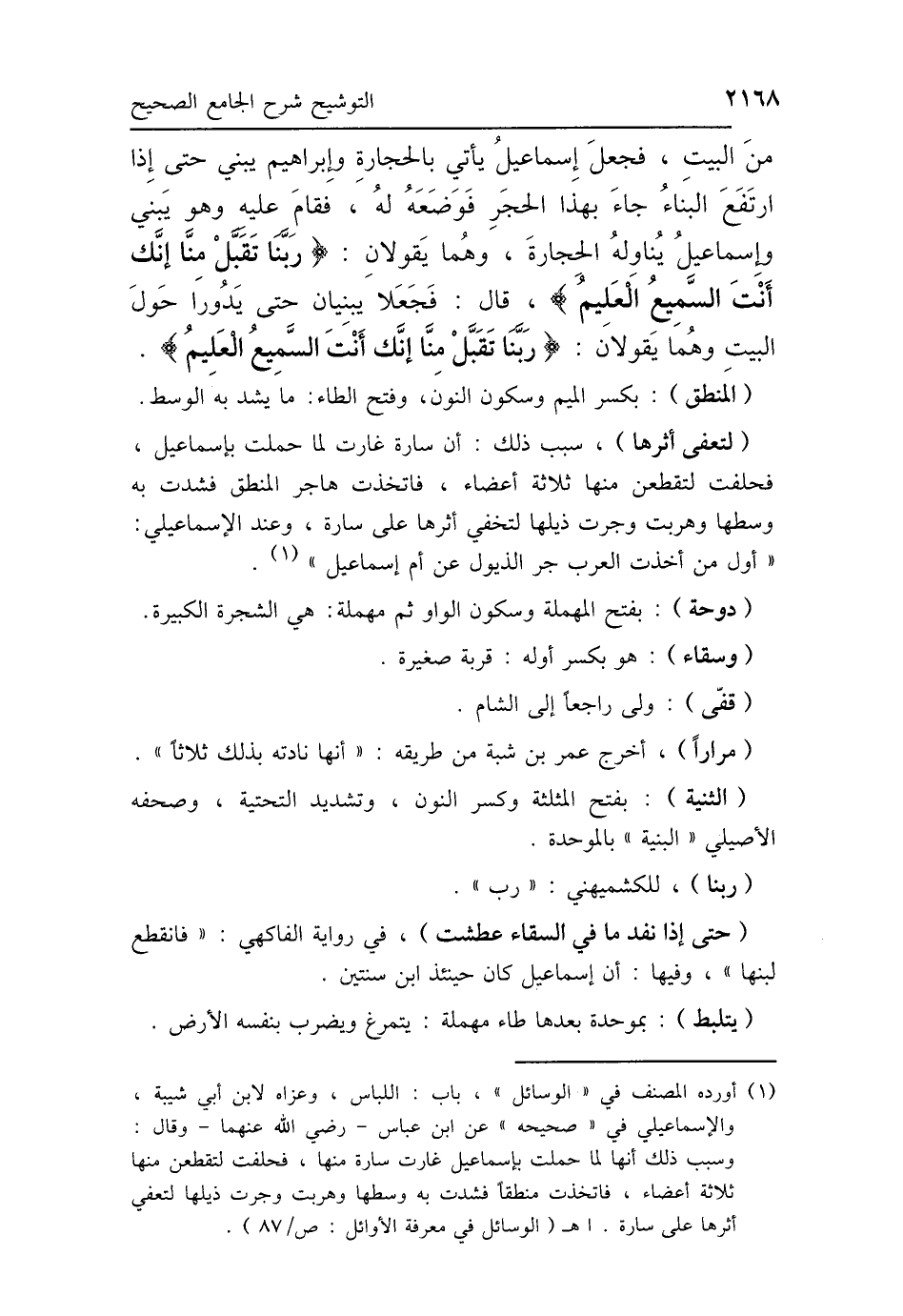 (لتعفى أثرها)، سبب ذلك: أن سارة غارت لما حملت بإسماعيل، فحلفت لتقطعن منها ثلاثة أعضاء، فاتخذت هاجر المنطق فشدت به وسطها وهربت وجرت ذيلها لتخفي أثرها على سارة، وعند الإسماعيلي: "أول من أخذت العرب جر الذيول عن أم إسماعيل".