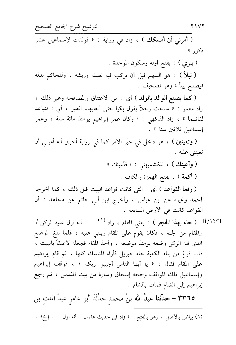 (جاء بهذا الحجر): يعني المقام، زاد أنه نزل عليه الركن والمقام من الجنة، فكان يقوم على المقام ويبني عليه، فلما بلغ الموضع الذي فيه الركن وضعه يومئذ موضعه، وأخذ المقام فجعله لاصقًا بالبيت، فلما فرغ من بناء الكعبة جاء جبريل فأراه المناسك كلها، ثم قام إبراهيم على المقام فقال: "يا أيها الناس أجيبوا ربكم"، فوقف إبراهيم وإسماعيل تلك المواقف وحجه إسحاق وسارة من بيت المقدس، ثم رجع إبراهيم إلى الشام فمات بالشام.