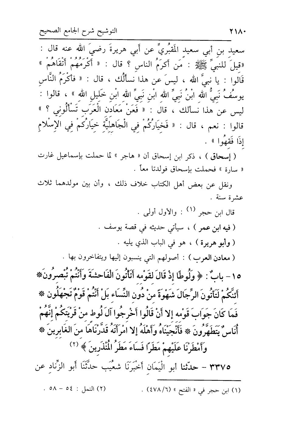 سَعِيدِ بْنِ أَبِي سَعِيدٍ المَقْبُرِيِّ، عَنْ أَبِي هُرَيْرَةَ رَضِيَ اللَّهُ عَنْهُ، قَالَ: قِيلَ لِلنَّبِيِّ صَلَّى اللهُ عَلَيْهِ وَسَلَّمَ، مَنْ أَكْرَمُ النَّاسِ؟ قَالَ «أَكْرَمُهُمْ أَتْقَاهُمْ» قَالُوا: يَا نَبِيَّ اللَّهِ، لَيْسَ عَنْ هَذَا نَسْأَلُكَ، قَالَ: «فَأَكْرَمُ النَّاسِ يُوسُفُ نَبِيُّ اللَّهِ، ابْنُ نَبِيِّ اللَّهِ، ابْنِ نَبِيِّ اللَّهِ، ابْنِ خَلِيلِ اللَّهِ» قَالُوا: لَيْسَ عَنْ هَذَا نَسْأَلُكَ، قَالَ: «فَعَنْ مَعَادِنِ العَرَبِ تَسْأَلُونِي» قَالُوا: نَعَمْ، قَالَ: «فَخِيَارُكُمْ فِي الجَاهِلِيَّةِ خِيَارُكُمْ فِي الإِسْلاَمِ إِذَا فَقُهُوا».
