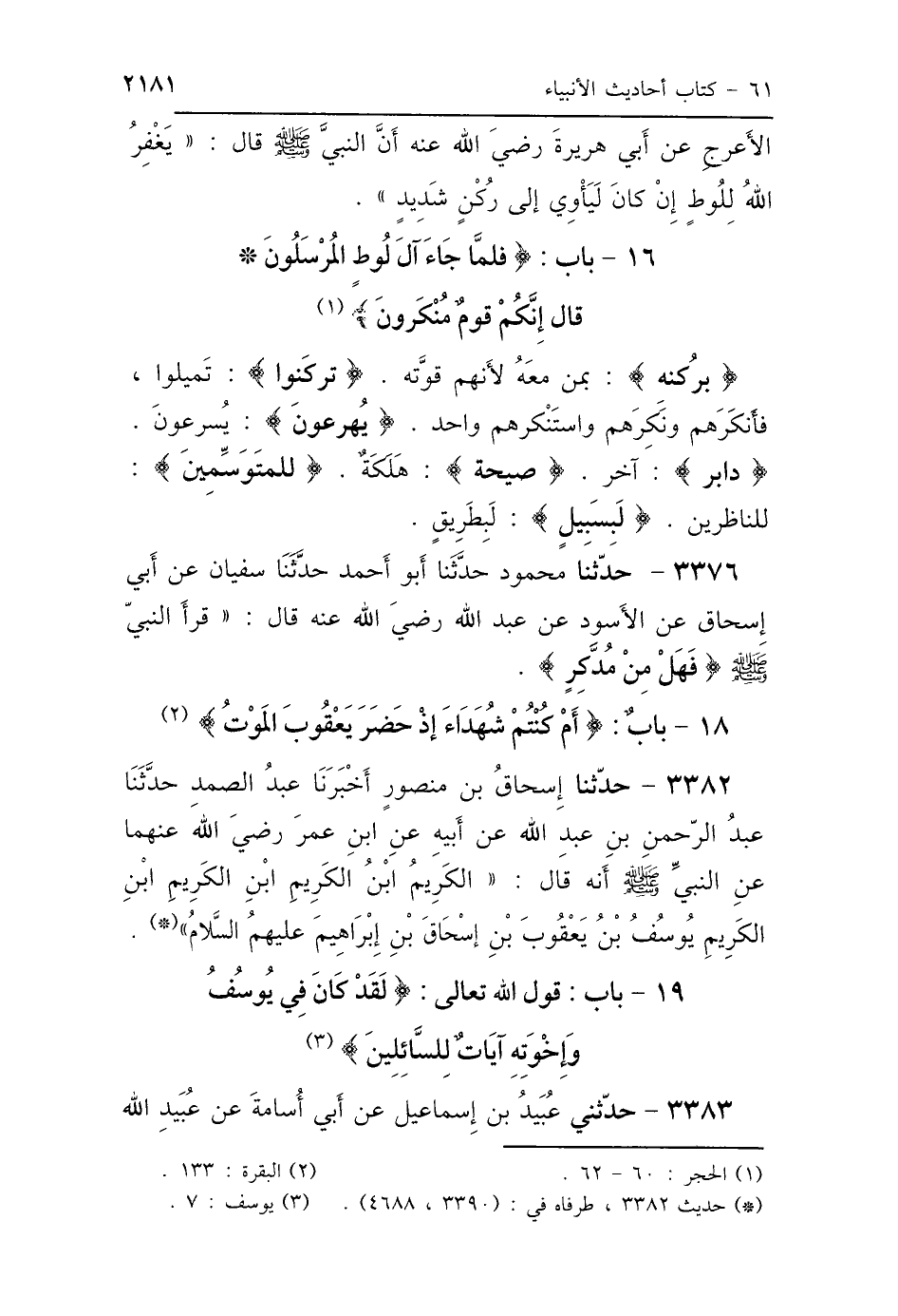 3383 - حَدَّثَنِي عُبَيْدُ بْنُ إِسْمَاعِيلَ، عَنْ أَبِي أُسَامَةَ، عَنْ عُبَيْدِ اللَّهِ،