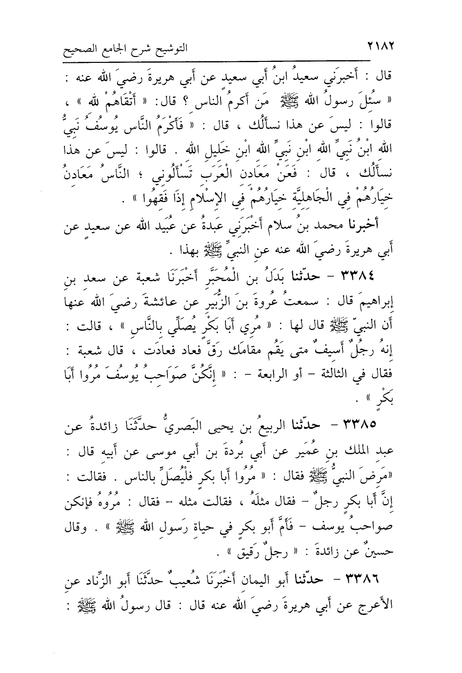 3384 - حَدَّثَنَا بَدَلُ بْنُ المُحَبَّرِ، أَخْبَرَنَا شُعْبَةُ، عَنْ سَعْدِ بْنِ إِبْرَاهِيمَ، قَالَ: سَمِعْتُ عُرْوَةَ بْنَ الزُّبَيْرِ، عَنْ عَائِشَةَ رَضِيَ اللَّهُ عَنْهَا، أَنَّ النَّبِيَّ صَلَّى اللهُ عَلَيْهِ وَسَلَّمَ، قَالَ لَهَا: «مُرِي أَبَا بَكْرٍ يُصَلِّي بِالنَّاسِ»، قَالَتْ: إِنَّهُ رَجُلٌ أَسِيفٌ، مَتَى يَقُمْ مَقَامَكَ رَقَّ. فَعَادَ فَعَادَتْ. قَالَ شُعْبَةُ فَقَالَ فِي الثَّالِثَةِ أَوِ الرَّابِعَةِ «إِنَّكُنَّ صَوَاحِبُ يُوسُفَ مُرُوا أَبَا بَكْرٍ».