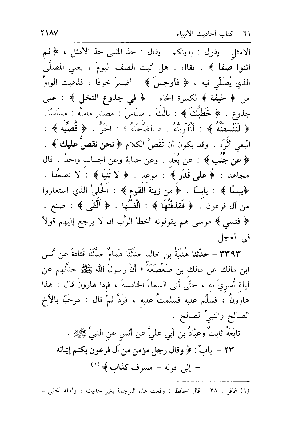 الأَمْثَلِ، يَقُولُ: بِدِينِكُمْ، يُقَالُ: خُذِ المُثْلَى خُذِ الأَمْثَلَ، {ثُمَّ ائْتُوا صَفًّا} [طه: 64]، يُقَالُ: هَلْ أَتَيْتَ الصَّفَّ اليَوْمَ، يَعْنِي المُصَلَّى الَّذِي يُصَلَّى فِيهِ، {فَأَوْجَسَ} [طه: 67]: أَضْمَرَ خَوْفًا، فَذَهَبَتِ الوَاوُ مِنْ {خِيفَةً} [هود: 70] لِكَسْرَةِ الخَاءِ. {فِي جُذُوعِ النَّخْلِ} [طه: 71]: عَلَى جُذُوعِ، {خَطْبُكَ} [طه: 95]: بَالُكَ. {مِسَاسَ} [طه: 97]: مَصْدَرُ مَاسَّهُ مِسَاسًا. {لَنَنْسِفَنَّهُ} [طه: 97]: لَنُذْرِيَنَّهُ. الضَّحَاءُ الحَرُّ. {قُصِّيهِ} [القصص: 11]: اتَّبِعِي أَثَرَهُ، وَقَدْ يَكُونُ أَنْ تَقُصَّ الكَلاَمَ. {نَحْنُ نَقُصُّ عَلَيْكَ} [يوسف: 3]: {عَنْ جُنُبٍ} [القصص: 11]: عَنْ بُعْدٍ، وَعَنْ جَنَابَةٍ وَعَنِ اجْتِنَابٍ وَاحِدٌ " قَالَ مُجَاهِدٌ: {عَلَى قَدَرٍ} [طه: 40]: «مَوْعِدٌ»، {لاَ تَنِيَا} [طه: 42]: «لاَ تَضْعُفَا». {يَبَسًا} [طه: 77]: «يَابِسَا»، {مِنْ زِينَةِ القَوْمِ} [طه: 87]: «الحُلِيِّ الَّذِي اسْتَعَارُوا مِنْ آلِ فِرْعَوْنَ»، فَقَذَفْتُهَا: «أَلْقَيْتَهَا»، {أَلْقَى} [النساء: 94]: «صَنَعَ»، {فَنَسِيَ} [طه: 88]: «مُوسَى»، هُمْ يَقُولُونَهُ: «أَخْطَأَ الرَّبَّ» {أَلَّا يَرْجِعَ إِلَيْهِمْ قَوْلًا} [طه: 89]: «فِي العِجْلِ».