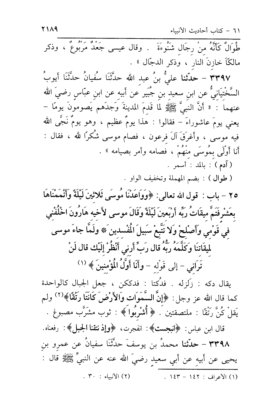 3397 - حَدَّثَنَا عَلِيُّ بْنُ عَبْدِ اللَّهِ، حَدَّثَنَا سُفْيَانُ، حَدَّثَنَا أَيُّوبُ السَّخْتِيَانِيُّ، عَنِ ابْنِ سَعِيدِ بْنِ جُبَيْرٍ، عَنْ أَبِيهِ، عَنِ ابْنِ عَبَّاسٍ رَضِيَ اللَّهُ عَنْهُمَا، أَنَّ النَّبِيَّ صَلَّى اللهُ عَلَيْهِ وَسَلَّمَ، لَمَّا قَدِمَ المَدِينَةَ، وَجَدَهُمْ يَصُومُونَ يَوْمًا، يَعْنِي عَاشُورَاءَ، فَقَالُوا: هَذَا يَوْمٌ عَظِيمٌ، وَهُوَ يَوْمٌ نَجَّى اللَّهُ فِيهِ مُوسَى، وَأَغْرَقَ آلَ فِرْعَوْنَ، فَصَامَ مُوسَى شُكْرًا لِلَّهِ، فَقَالَ «أَنَا أَوْلَى بِمُوسَى مِنْهُمْ» فَصَامَهُ وَأَمَرَ بِصِيَامِهِ.