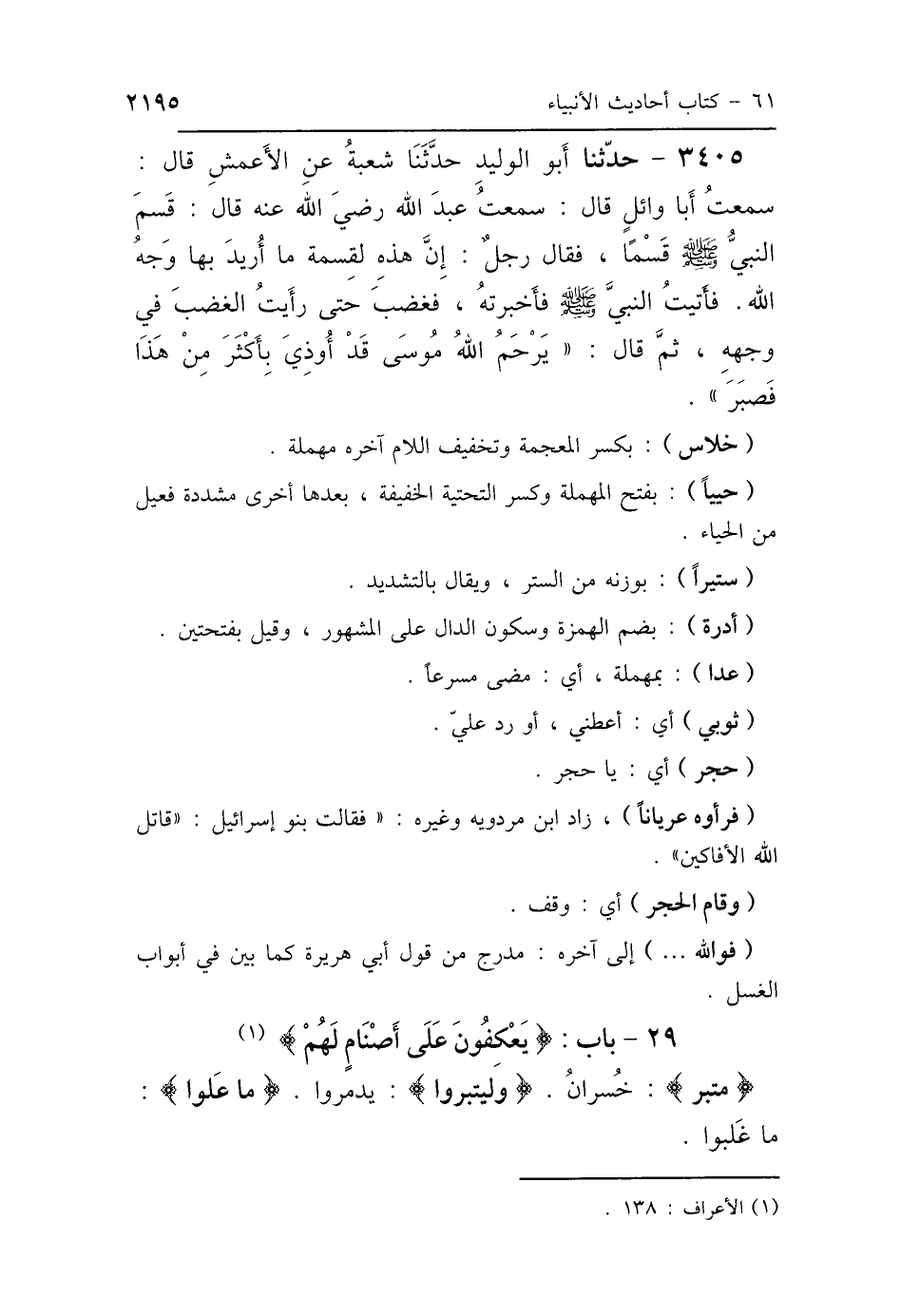 3405 - حَدَّثَنَا أَبُو الوَلِيدِ، حَدَّثَنَا شُعْبَةُ، عَنِ الأَعْمَشِ، قَالَ: سَمِعْتُ أَبَا وَائِلٍ، قَالَ: سَمِعْتُ عَبْدَ اللَّهِ رَضِيَ اللَّهُ عَنْهُ، قَالَ: قَسَمَ النَّبِيُّ صَلَّى اللهُ عَلَيْهِ وَسَلَّمَ قَسْمًا، فَقَالَ رَجُلٌ: إِنَّ هَذِهِ لَقِسْمَةٌ مَا أُرِيدَ بِهَا وَجْهُ اللَّهِ، فَأَتَيْتُ النَّبِيَّ صَلَّى اللهُ عَلَيْهِ وَسَلَّمَ فَأَخْبَرْتُهُ، فَغَضِبَ حَتَّى رَأَيْتُ الغَضَبَ فِي وَجْهِهِ، ثُمَّ قَالَ: يَرْحَمُ اللَّهَ مُوسَى، قَدْ أُوذِيَ بِأَكْثَرَ مِنْ هَذَا فَصَبَرَ".