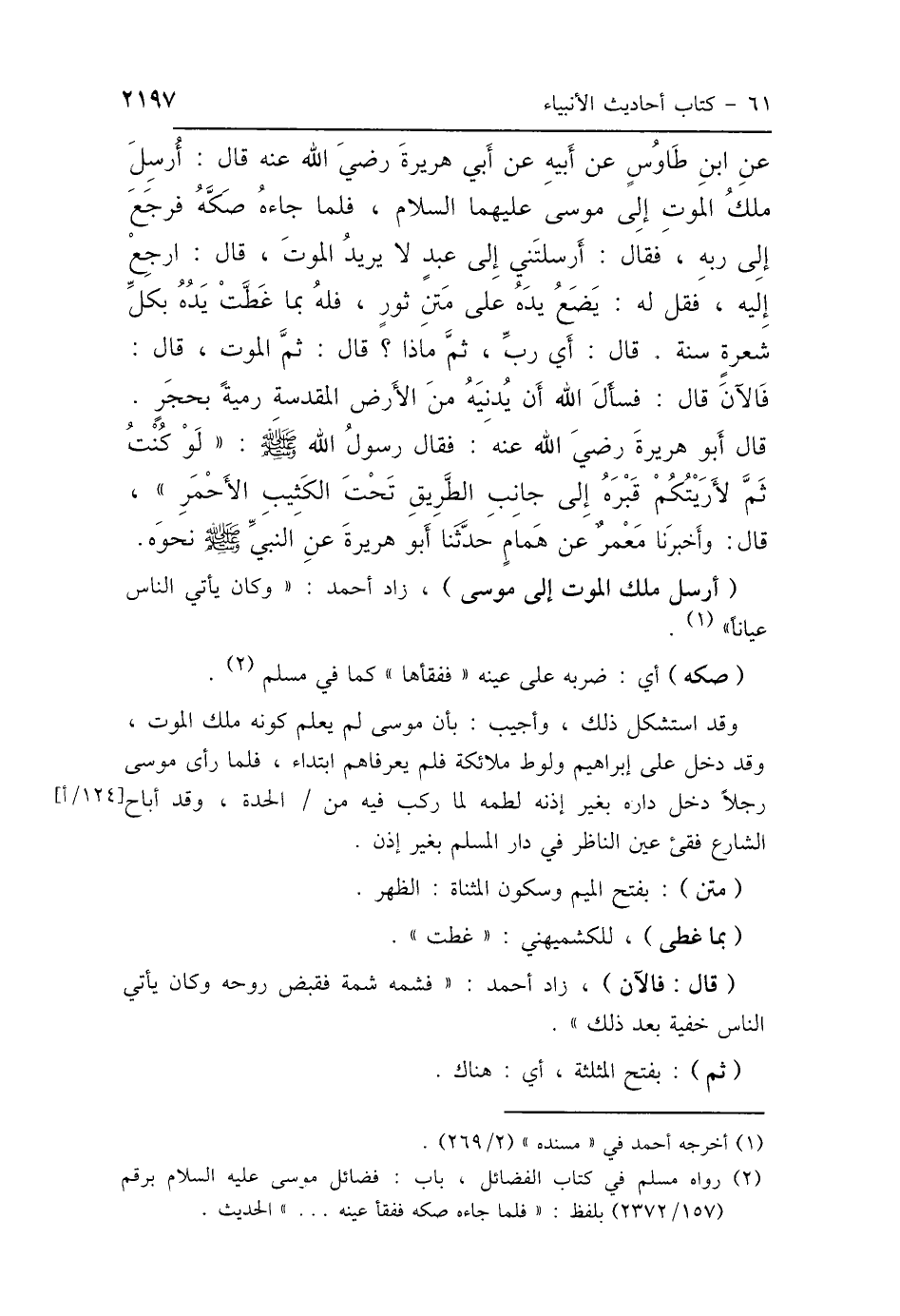 (أرسل ملك الموت إلى موسى)، زاد أحمد: "وكان يأتي الناس عيانا".