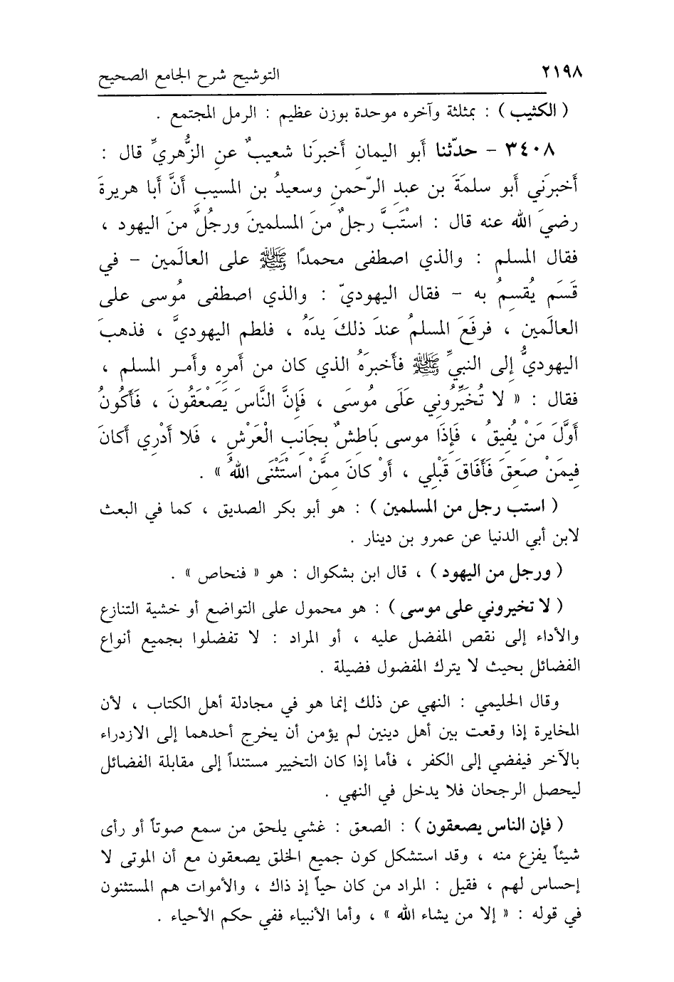 3408 - حَدَّثَنَا أَبُو اليَمَانِ، أَخْبَرَنَا شُعَيْبٌ، عَنِ الزُّهْرِيِّ، قَالَ: أَخْبَرَنِي أَبُو سَلَمَةَ بْنُ عَبْدِ الرَّحْمَنِ، وَسَعِيدُ بْنُ المُسَيِّبِ، أَنَّ أَبَا هُرَيْرَةَ رَضِيَ اللَّهُ عَنْهُ، قَالَ: اسْتَبَّ رَجُلٌ مِنَ المُسْلِمِينَ وَرَجُلٌ مِنَ اليَهُودِ، فَقَالَ المُسْلِمُ: وَالَّذِي اصْطَفَى مُحَمَّدًا صَلَّى اللهُ عَلَيْهِ وَسَلَّمَ عَلَى العَالَمِينَ، فِي قَسَمٍ يُقْسِمُ بِهِ، فَقَالَ اليَهُودِيُّ: وَالَّذِي اصْطَفَى مُوسَى عَلَى العَالَمِينَ، فَرَفَعَ المُسْلِمُ عِنْدَ ذَلِكَ يَدَهُ فَلَطَمَ اليَهُودِيَّ، فَذَهَبَ اليَهُودِيُّ إِلَى النَّبِيِّ صَلَّى اللهُ عَلَيْهِ وَسَلَّمَ فَأَخْبَرَهُ الَّذِي كَانَ مِنْ أَمْرِهِ وَأَمْرِ المُسْلِمِ، فَقَالَ «لاَ تُخَيِّرُونِي عَلَى مُوسَى، فَإِنَّ النَّاسَ يَصْعَقُونَ، فَأَكُونُ أَوَّلَ مَنْ يُفِيقُ، فَإِذَا مُوسَى بَاطِشٌ بِجَانِبِ العَرْشِ، فَلاَ أَدْرِي أَكَانَ فِيمَنْ صَعِقَ فَأَفَاقَ قَبْلِي، أَوْ كَانَ مِمَّنِ اسْتَثْنَى اللَّهُ».