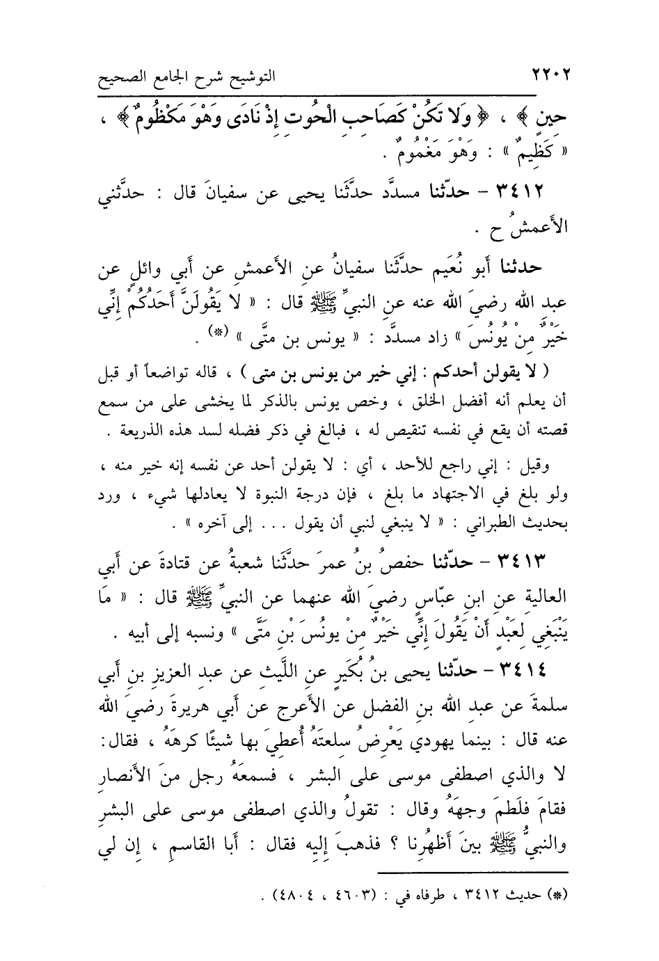 3412 - حَدَّثَنَا مُسَدَّدٌ، حَدَّثَنَا يَحْيَى، عَنْ سُفْيَانَ، قَالَ: حَدَّثَنِي الأَعْمَشُ، ح حَدَّثَنَا أَبُو نُعَيْمٍ، حَدَّثَنَا سُفْيَانُ، عَنِ الأَعْمَشِ، عَنْ أَبِي وَائِلٍ، عَنْ عَبْدِ اللَّهِ رَضِيَ اللَّهُ عَنْهُ، عَنِ النَّبِيِّ صَلَّى اللهُ عَلَيْهِ وَسَلَّمَ، قَالَ: " لاَ يَقُولَنَّ أَحَدُكُمْ: إِنِّي خَيْرٌ مِنْ يُونُسَ " زَادَ مُسَدَّدٌ: «يُونُسَ بْنِ مَتَّى».