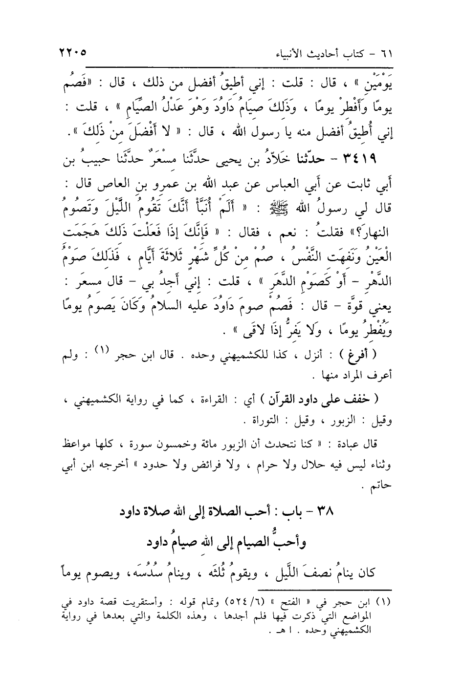 3419 - حَدَّثَنَا خَلَّادُ بْنُ يَحْيَى، حَدَّثَنَا مِسْعَرٌ، حَدَّثَنَا حَبِيبُ بْنُ أَبِي ثَابِتٍ، عَنْ أَبِي العَبَّاسِ، عَنْ عَبْدِ اللَّهِ بْنِ عَمْرِو بْنِ العَاصِ، قَالَ: قَالَ لِي رَسُولُ اللَّهِ صَلَّى اللهُ عَلَيْهِ وَسَلَّمَ: «أَلَمْ أُنَبَّأْ أَنَّكَ تَقُومُ اللَّيْلَ وَتَصُومُ النَّهَارَ» فَقُلْتُ: نَعَمْ، فَقَالَ: «فَإِنَّكَ إِذَا فَعَلْتَ ذَلِكَ هَجَمَتِ العَيْنُ، وَنَفِهَتِ النَّفْسُ، صُمْ مِنْ كُلِّ شَهْرٍ ثَلاَثَةَ أَيَّامٍ، فَذَلِكَ صَوْمُ الدَّهْرِ، أَوْ كَصَوْمِ الدَّهْرِ» قُلْتُ: إِنِّي أَجِدُ بِي، - قَالَ مِسْعَرٌ يَعْنِي قُوَّةً - قَالَ: «فَصُمْ صَوْمَ دَاوُدَ عَلَيْهِ السَّلاَمُ، وَكَانَ يَصُومُ يَوْمًا وَيُفْطِرُ يَوْمًا، وَلاَ يَفِرُّ إِذَا لاَقَى».