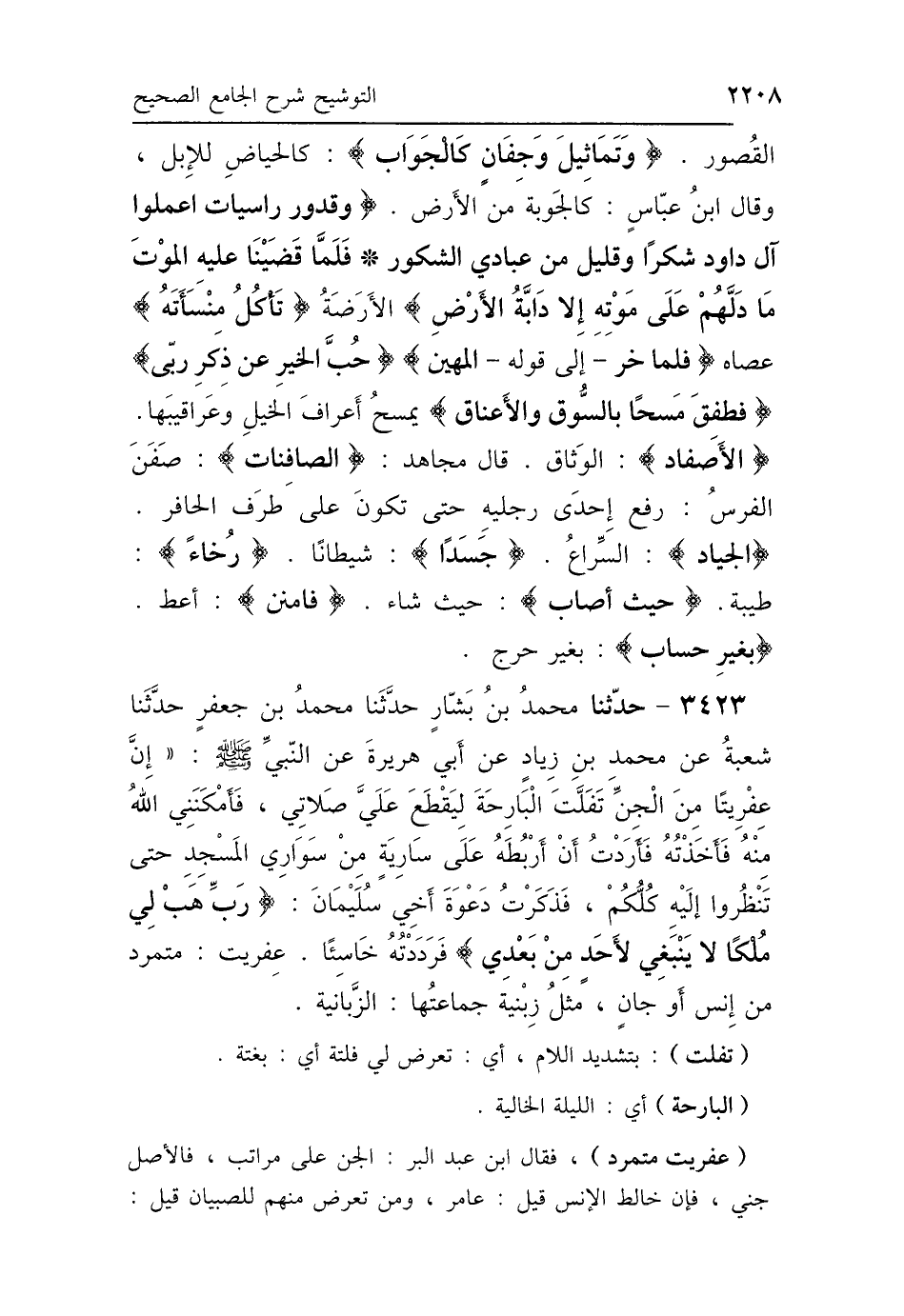 القُصُورِ {وَتَمَاثِيلَ وَجِفَانٍ كَالْجَوَابِ} [سبأ: 13]: كَالحِيَاضِ لِلْإِبِلِ وَقَالَ ابْنُ عَبَّاسٍ: " كَالْجَوْبَةِ مِنَ الأَرْضِ {وَقُدُورٍ رَاسِيَاتٍ اعْمَلُوا آلَ دَاوُدَ شُكْرًا وَقَلِيلٌ مِنْ عِبَادِيَ الشَّكُورُ، فَلَمَّا قَضَيْنَا عَلَيْهِ المَوْتَ مَا دَلَّهُمْ عَلَى مَوْتِهِ إِلَّا دَابَّةُ الأَرْضِ}: الأَرَضَةُ {تَأْكُلُ مِنْسَأَتَهُ} [سبأ: 14]: عَصَاهُ، {فَلَمَّا خَرَّ} [سبأ: 14]- إِلَى قَوْلِهِ - {فِي العَذَابِ المُهِينِ} [سبأ: 14] {حُبَّ الخَيْرِ عَنْ ذِكْرِ رَبِّي} [ص: 32]. . {فَطَفِقَ مَسْحًا بِالسُّوقِ وَالأَعْنَاقِ} [ص: 33]: يَمْسَحُ أَعْرَافَ الخَيْلِ وَعَرَاقِيبَهَا. {الأَصْفَادُ} [إبراهيم: 49]: الوَثَاقُ " قَالَ مُجَاهِدٌ: " {الصَّافِنَاتُ} [ص: 31] صَفَنَ الفَرَسُ: رَفَعَ إِحْدَى رِجْلَيْهِ حَتَّى تَكُونَ عَلَى طَرَفِ الحَافِرِ، {الجِيَادُ} [ص: 31]: السِّرَاعُ. {جَسَدًا} [الأعراف: 148]: شَيْطَانًا، {رُخَاءً} [ص: 36]: طَيِّبَةً {حَيْثُ أَصَابَ} [ص: 36]: حَيْثُ شَاءَ، {فَامْنُنْ} [ص: 39]: أَعْطِ {بِغَيْرِ حِسَابٍ} [البقرة: 212]: بِغَيْرِ حَرَجٍ".