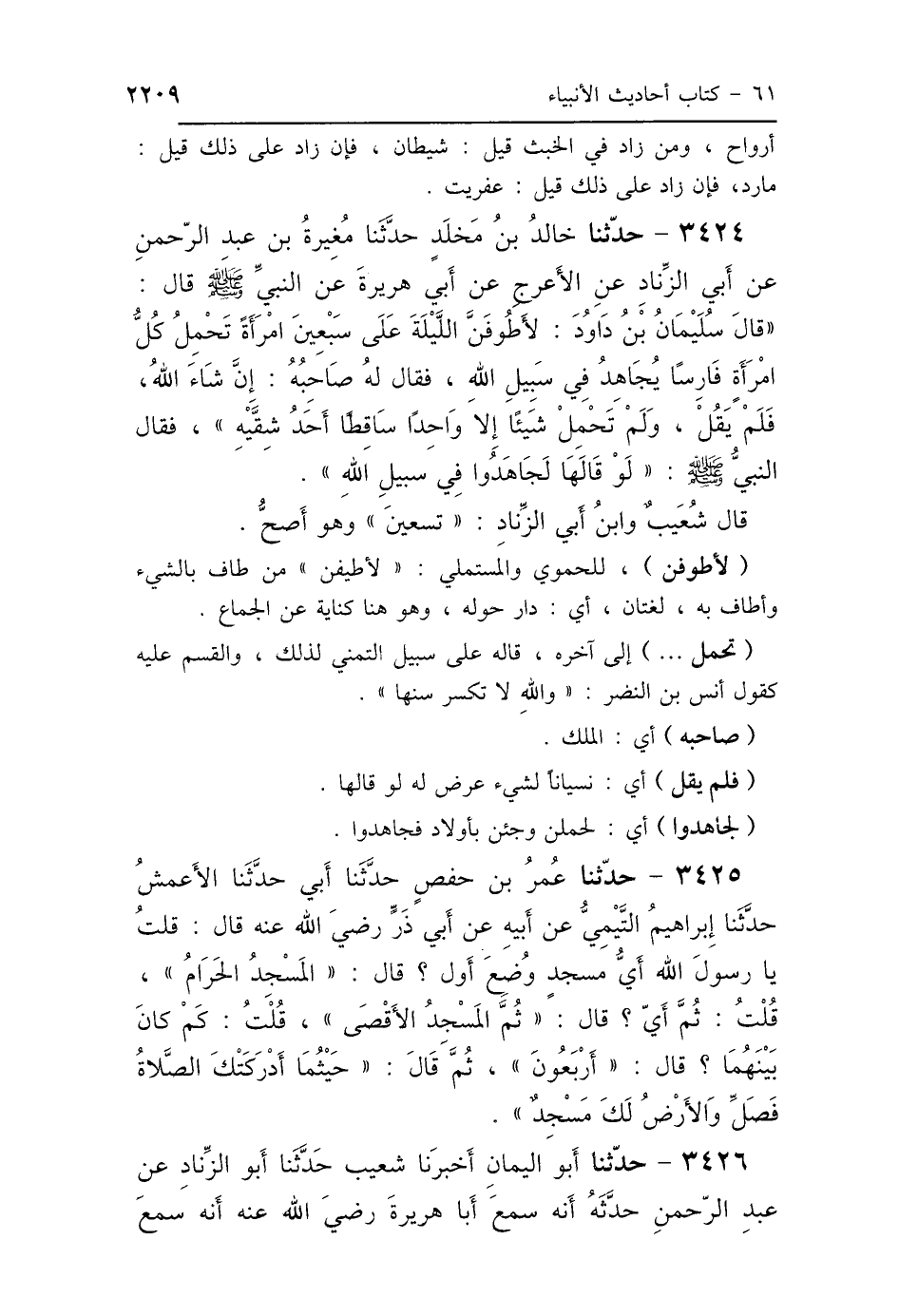 3424 - حَدَّثَنَا خَالِدُ بْنُ مَخْلَدٍ، حَدَّثَنَا مُغِيرَةُ بْنُ عَبْدِ الرَّحْمَنِ، عَنْ أَبِي الزِّنَادِ، عَنِ الأَعْرَجِ، عَنْ أَبِي هُرَيْرَةَ، عَنِ النَّبِيِّ صَلَّى اللهُ عَلَيْهِ وَسَلَّمَ، قَالَ: قَالَ: سُلَيْمَانُ بْنُ دَاوُدَ لَأَطُوفَنَّ اللَّيْلَةَ عَلَى سَبْعِينَ امْرَأَةً، تَحْمِلُ كُلُّ امْرَأَةٍ فَارِسًا يُجَاهِدُ فِي سَبِيلِ اللَّهِ، فَقَالَ لَهُ صَاحِبُهُ: إِنْ شَاءَ اللَّهُ، فَلَمْ يَقُلْ، وَلَمْ تَحْمِلْ شَيْئًا إِلَّا وَاحِدًا، سَاقِطًا أَحَدُ شِقَّيْهِ، فَقَالَ النَّبِيُّ صَلَّى اللهُ عَلَيْهِ وَسَلَّمَ: لَوْ قَالَهَا لَجَاهَدُوا فِي سَبِيلِ اللَّهِ " قَالَ شُعَيْبٌ وَابْنُ أَبِي الزِّنَادِ: تِسْعِينَ وَهُوَ أَصَحُّ.