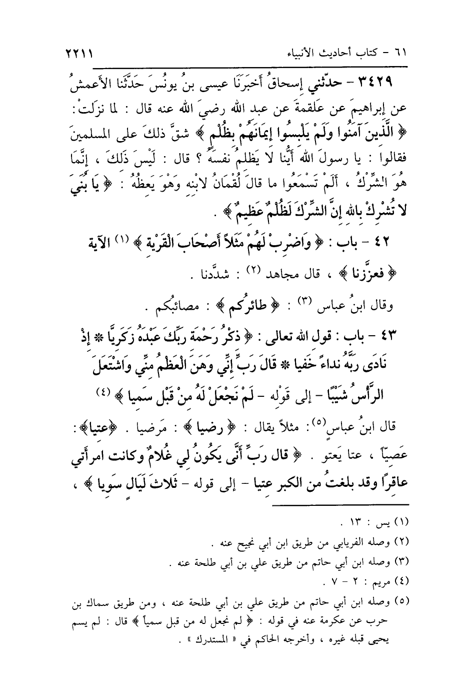 3429 - حَدَّثَنِي إِسْحَاقُ، أَخْبَرَنَا عِيسَى بْنُ يُونُسَ، حَدَّثَنَا الأَعْمَشُ، عَنْ إِبْرَاهِيمَ، عَنْ عَلْقَمَةَ، عَنْ عَبْدِ اللَّهِ رَضِيَ اللَّهُ عَنْهُ، قَالَ: لَمَّا نَزَلَتْ {الَّذِينَ آمَنُوا وَلَمْ يَلْبِسُوا} [الأنعام: 82] إِيمَانَهُمْ بِظُلْمٍ شَقَّ ذَلِكَ عَلَى المُسْلِمِينَ، فَقَالُوا: يَا رَسُولَ اللَّهِ، أَيُّنَا لاَ يَظْلِمُ نَفْسَهُ؟ قَالَ: «لَيْسَ ذَلِكَ إِنَّمَا هُوَ الشِّرْكُ أَلَمْ تَسْمَعُوا مَا قَالَ لُقْمَانُ لِابْنِهِ وَهُوَ يَعِظُهُ يَا بُنَيَّ لاَ تُشْرِكْ بِاللَّهِ إِنَّ الشِّرْكَ لَظُلْمٌ عَظِيمٌ».