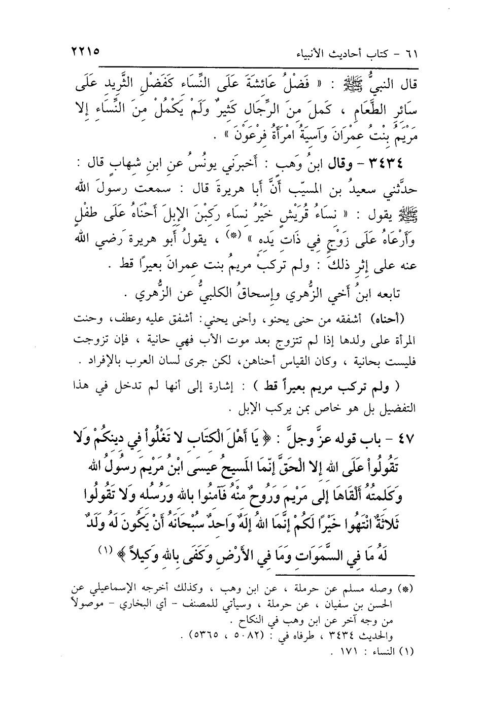 47 - بَابُ قَوْلِهِ: {يَا أَهْلَ الكِتَابِ لاَ تَغْلُوا فِي دِينِكُمْ وَلاَ تَقُولُوا عَلَى اللَّهِ إِلَّا الحَقَّ إِنَّمَا المَسِيحُ عِيسَى ابْنُ مَرْيَمَ رَسُولُ اللَّهِ وَكَلِمَتُهُ أَلْقَاهَا إِلَى مَرْيَمَ وَرُوحٌ مِنْهُ فَآمِنُوا بِاللَّهِ وَرُسُلِهِ وَلاَ تَقُولُوا ثَلاَثَةٌ انْتَهُوا خَيْرًا لَكُمْ إِنَّمَا اللَّهُ إِلَهٌ وَاحِدٌ سُبْحَانَهُ أَنْ يَكُونَ لَهُ وَلَدٌ لَهُ مَا فِي السَّمَوَاتِ وَمَا فِي الأَرْضِ وَكَفَى بِاللَّهِ وَكِيلًا}
