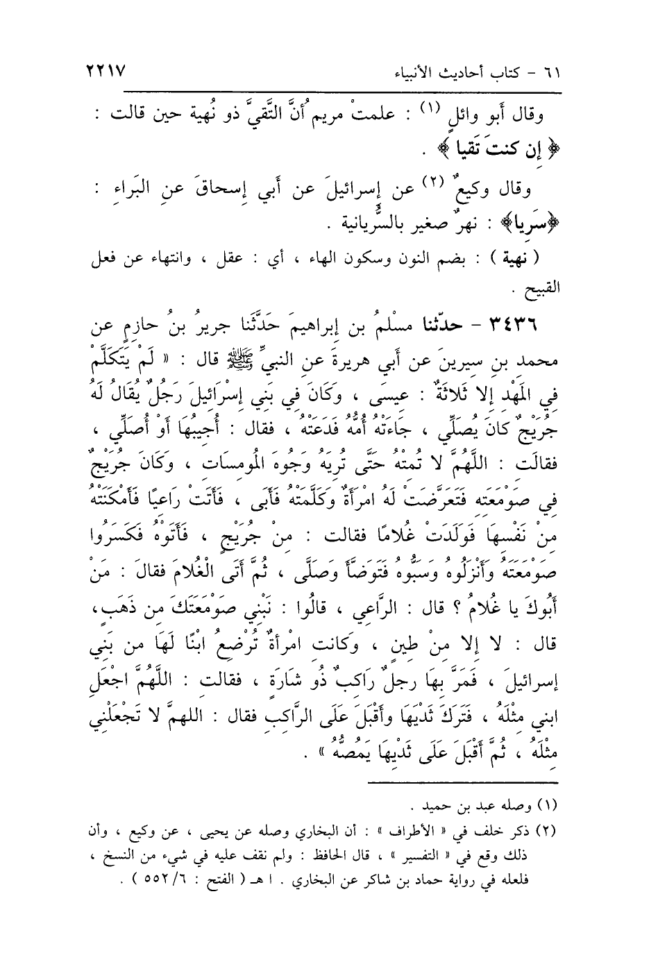 3436 - حَدَّثَنَا مُسْلِمُ بْنُ إِبْرَاهِيمَ، حَدَّثَنَا جَرِيرُ بْنُ حَازِمٍ، عَنْ مُحَمَّدِ بْنِ سِيرِينَ، عَنْ أَبِي هُرَيْرَةَ، عَنِ النَّبِيِّ صَلَّى اللهُ عَلَيْهِ وَسَلَّمَ، قَالَ: " لَمْ يَتَكَلَّمْ فِي المَهْدِ إِلَّا ثَلاَثَةٌ: عِيسَى، وَكَانَ فِي بَنِي إِسْرَائِيلَ رَجُلٌ يُقَالُ لَهُ جُرَيْجٌ، كَانَ يُصَلِّي، جَاءَتْهُ أُمُّهُ فَدَعَتْهُ، فَقَالَ: أُجِيبُهَا أَوْ أُصَلِّي، فَقَالَتْ: اللَّهُمَّ لاَ تُمِتْهُ حَتَّى تُرِيَهُ وُجُوهَ المُومِسَاتِ، وَكَانَ جُرَيْجٌ فِي صَوْمَعَتِهِ، فَتَعَرَّضَتْ لَهُ امْرَأَةٌ وَكَلَّمَتْهُ فَأَبَى، فَأَتَتْ رَاعِيًا فَأَمْكَنَتْهُ مِنْ نَفْسِهَا، فَوَلَدَتْ غُلاَمًا، فَقَالَتْ: مِنْ جُرَيْجٍ فَأَتَوْهُ فَكَسَرُوا صَوْمَعَتَهُ وَأَنْزَلُوهُ وَسَبُّوهُ، فَتَوَضَّأَ وَصَلَّى ثُمَّ أَتَى الغُلاَمَ، فَقَالَ: مَنْ أَبُوكَ يَا غُلاَمُ؟ قَالَ: الرَّاعِي، قَالُوا: نَبْنِي صَوْمَعَتَكَ مِنْ ذَهَبٍ؟ قَالَ: لاَ، إِلَّا مِنْ طِينٍ. وَكَانَتِ امْرَأَةٌ تُرْضِعُ ابْنًا لَهَا مِنْ بَنِي إِسْرَائِيلَ، فَمَرَّ بِهَا رَجُلٌ رَاكِبٌ ذُو شَارَةٍ فَقَالَتْ: اللَّهُمَّ اجْعَلِ ابْنِي مِثْلَهُ، فَتَرَكَ ثَدْيَهَا وَأَقْبَلَ عَلَى الرَّاكِبِ، فَقَالَ: اللَّهُمَّ لاَ تَجْعَلْنِي مِثْلَهُ، ثُمَّ أَقْبَلَ عَلَى ثَدْيِهَا يَمَصُّهُ.