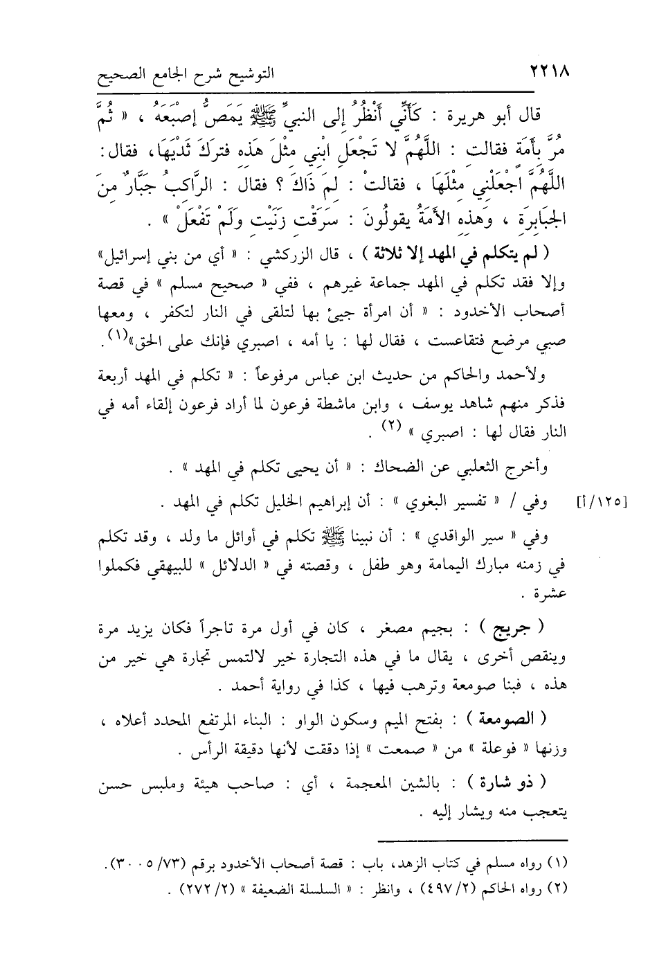 (لم يتكلم في المهد إلا ثلاثة)، قال الزركشي: "أي من بني إسرائيل" وإلا فقد تكلم في المهد جماعة غيرهم، ففي "صحيح مسلم" في قصة أصحاب الأخدود: "أن امرأة جيئ بها لتلقى في النار لتكفر، ومعها صبي مرضع فتقاعست، فقال لها: يا أمه، اصبري فإنك على الحق".