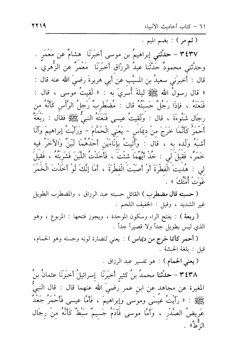 3437 - حَدَّثَنِي إِبْرَاهِيمُ بْنُ مُوسَى، أَخْبَرَنَا هِشَامٌ، عَنْ مَعْمَرٍ، وَحَدَّثَنِي مَحْمُودٌ، حَدَّثَنَا عَبْدُ الرَّزَّاقِ، أَخْبَرَنَا مَعْمَرٌ، عَنِ الزُّهْرِيِّ، قَالَ: أَخْبَرَنِي سَعِيدُ بْنُ المُسَيِّبِ، عَنْ أَبِي هُرَيْرَةَ رَضِيَ اللَّهُ عَنْهُ، قَالَ: قَالَ رَسُولُ اللَّهِ صَلَّى اللهُ عَلَيْهِ وَسَلَّمَ: لَيْلَةَ أُسْرِيَ بِهِ: " لَقِيتُ مُوسَى، قَالَ: فَنَعَتَهُ، فَإِذَا رَجُلٌ - حَسِبْتُهُ قَالَ - مُضْطَرِبٌ رَجِلُ الرَّأْسِ، كَأَنَّهُ مِنْ رِجَالِ شَنُوءَةَ، قَالَ: وَلَقِيتُ عِيسَى فَنَعَتَهُ النَّبِيُّ صَلَّى اللهُ عَلَيْهِ وَسَلَّمَ فَقَالَ: - رَبْعَةٌ أَحْمَرُ، كَأَنَّمَا خَرَجَ مِنْ دِيمَاسٍ - يَعْنِي الحَمَّامَ -، وَرَأَيْتُ إِبْرَاهِيمَ وَأَنَا أَشْبَهُ وَلَدِهِ بِهِ، قَالَ: وَأُتِيتُ بِإِنَاءَيْنِ، أَحَدُهُمَا لَبَنٌ وَالآخَرُ فِيهِ خَمْرٌ، فَقِيلَ لِي: خُذْ أَيَّهُمَا شِئْتَ، فَأَخَذْتُ اللَّبَنَ فَشَرِبْتُهُ، فَقِيلَ لِي: هُدِيتَ الفِطْرَةَ، أَوْ أَصَبْتَ الفِطْرَةَ، أَمَا إِنَّكَ لَوْ أَخَذْتَ الخَمْرَ غَوَتْ أُمَّتُكَ".