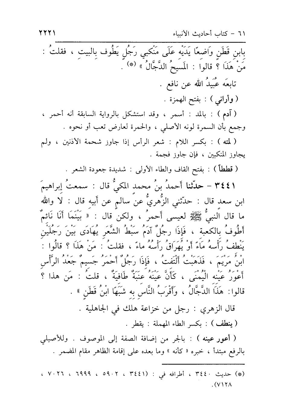 3441 - حَدَّثَنَا أَحْمَدُ بْنُ مُحَمَّدٍ المَكِّيُّ، قَالَ: سَمِعْتُ إِبْرَاهِيمَ بْنَ سَعْدٍ، قَالَ: حَدَّثَنِي الزُّهْرِيُّ، عَنْ سَالِمٍ، عَنْ أَبِيهِ، قَالَ: لاَ وَاللَّهِ مَا قَالَ النَّبِيُّ صَلَّى اللهُ عَلَيْهِ وَسَلَّمَ لِعِيسَى أَحْمَرُ، وَلَكِنْ قَالَ: " بَيْنَمَا أَنَا نَائِمٌ أَطُوفُ بِالكَعْبَةِ، فَإِذَا رَجُلٌ آدَمُ، سَبْطُ الشَّعَرِ، يُهَادَى بَيْنَ رَجُلَيْنِ، يَنْطِفُ رَأْسُهُ مَاءً، أَوْ يُهَرَاقُ رَأْسُهُ مَاءً، فَقُلْتُ: مَنْ هَذَا؟ قَالُوا: ابْنُ مَرْيَمَ، فَذَهَبْتُ أَلْتَفِتُ، فَإِذَا رَجُلٌ أَحْمَرُ جَسِيمٌ، جَعْدُ الرَّأْسِ، أَعْوَرُ عَيْنِهِ اليُمْنَى، كَأَنَّ عَيْنَهُ عِنَبَةٌ طَافِيَةٌ، قُلْتُ: مَنْ هَذَا؟ قَالُوا: هَذَا الدَّجَّالُ، وَأَقْرَبُ النَّاسِ بِهِ، شَبَهًا ابْنُ قَطَنٍ " قَالَ الزُّهْرِيُّ: رَجُلٌ مِنْ خُزَاعَةَ، هَلَكَ فِي الجَاهِلِيَّةِ.