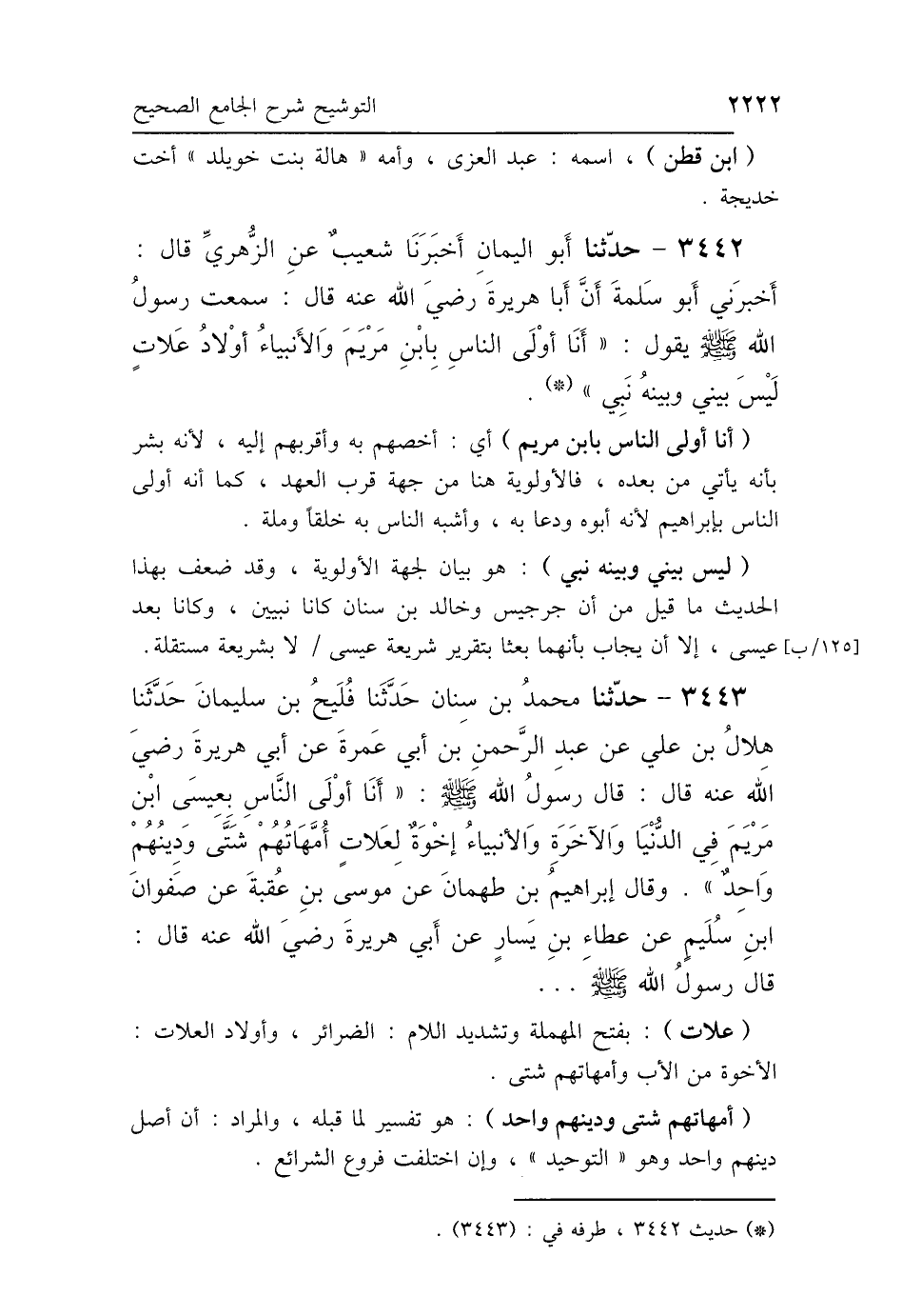3442 - حَدَّثَنَا أَبُو اليَمَانِ، أَخْبَرَنَا شُعَيْبٌ، عَنِ الزُّهْرِيِّ، قَالَ: أَخْبَرَنِي أَبُو سَلَمَةَ بْنُ عَبْدِ الرَّحْمَنِ، أَنَّ أَبَا هُرَيْرَةَ رَضِيَ اللَّهُ عَنْهُ، قَالَ: سَمِعْتُ رَسُولَ اللَّهِ صَلَّى اللهُ عَلَيْهِ وَسَلَّمَ، يَقُولُ: «أَنَا أَوْلَى النَّاسِ بِابْنِ مَرْيَمَ، وَالأَنْبِيَاءُ أَوْلاَدُ عَلَّاتٍ، لَيْسَ بَيْنِي وَبَيْنَهُ نَبِيٌّ».