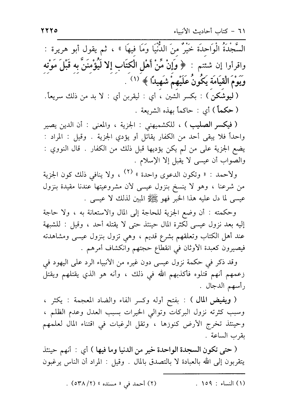 السَّجْدَةُ الوَاحِدَةُ خَيْرًا مِنَ الدُّنْيَا وَمَا فِيهَا»، ثُمَّ يَقُولُ أَبُو هُرَيْرَةَ: "وَاقْرَءُوا إِنْ شِئْتُمْ: {وَإِنْ مِنْ أَهْلِ الكِتَابِ إِلَّا لَيُؤْمِنَنَّ بِهِ قَبْلَ مَوْتِهِ، وَيَوْمَ القِيَامَةِ يَكُونُ عَلَيْهِمْ شَهِيدًا} [النساء: 159] ".